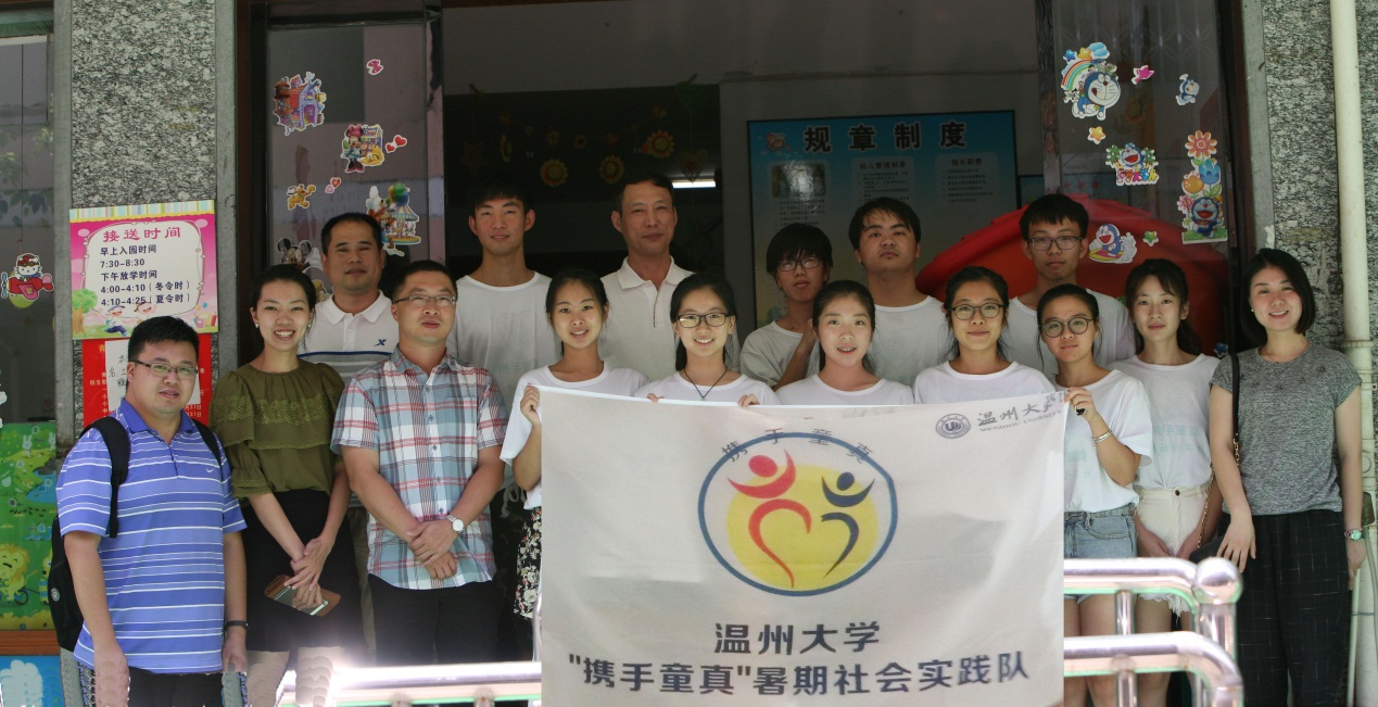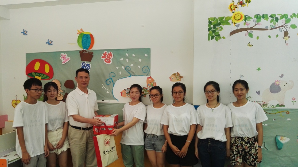 图为2016年7月19日,William威廉党委副书记牟德刚教授、williamhill党总支书记杨立淮老师、校团委屠霁霞书记、魏一副书记、大鹏老师、学生科辅导员严晓秋老师一行人来到丽水青田好孩子幼儿园慰问携手童真实践队。
