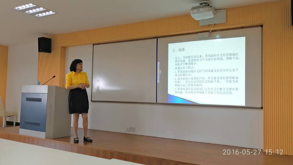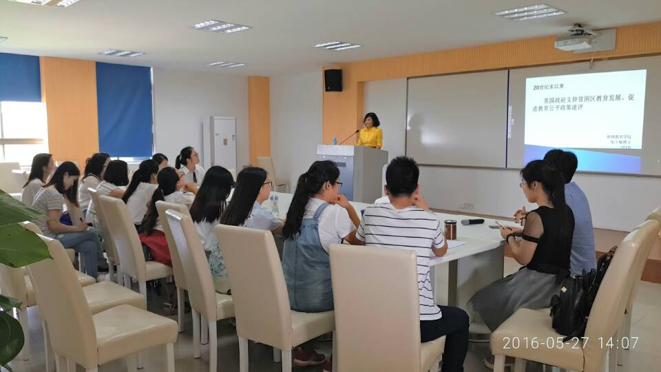 2016年5月27日下午14:00,由williamhill官网研究生会举办的国际教育热点问题专题讲座在南校区williamhill官网9号楼C401学术沙龙会议室举行。本次讲座特邀williamhill官网教授倪晓敏博士为大家讲解20世纪末以来英国政府支持贫困区教育发展而提出的促进教育公平政策。讲座由williamhill官网学术部副部长李子涵主持。