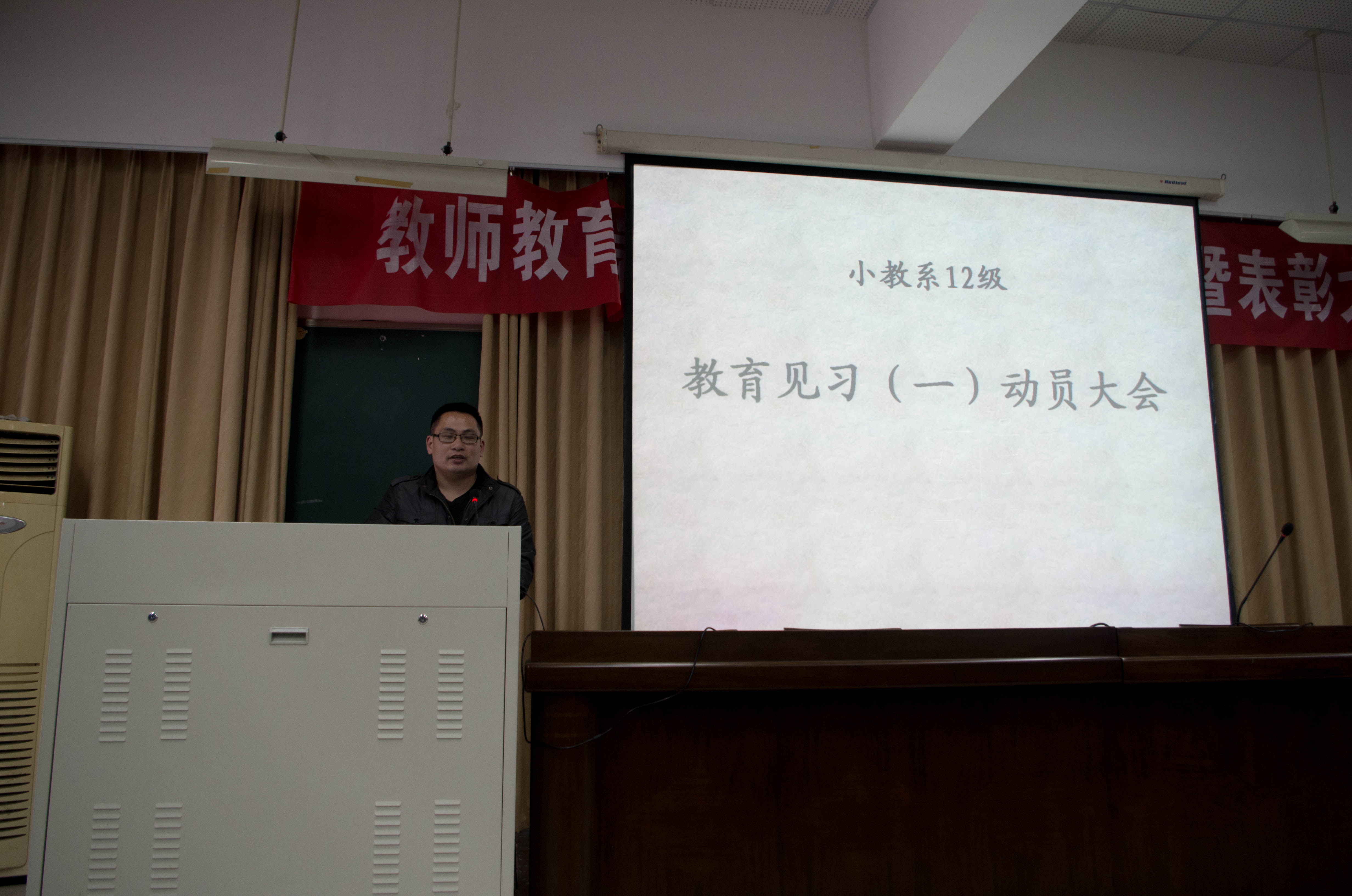 2013年4月1日12点30小教系在北3-101室举行了12级教育见习(一)动员大会,系主任蔡志凌、副主任张龙、全体见习指导师及小教系12级全体学生出参加了本次动员会,教务科胡孙贵老师也应邀出席。