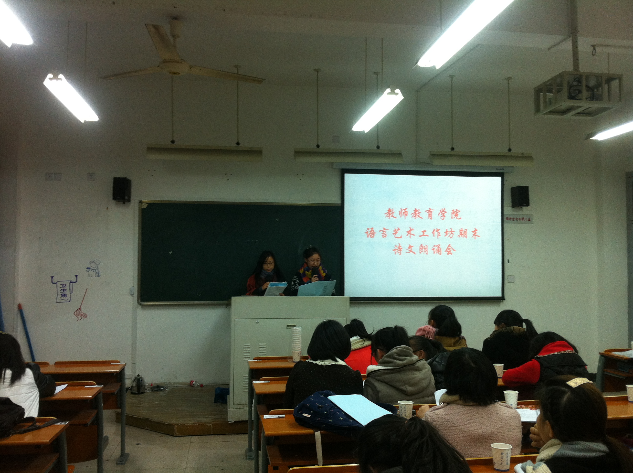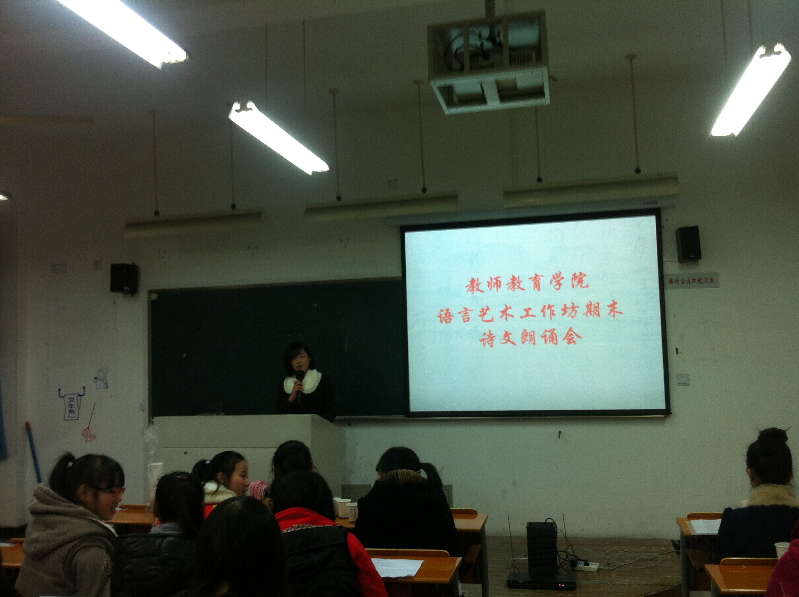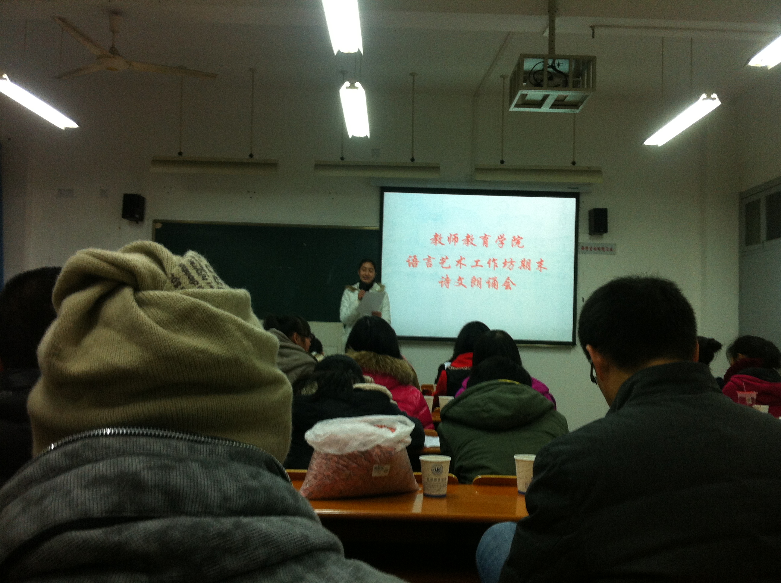 2012年12月23日晚,williamhill官网语言艺术工作坊年度朗诵会在北校区教育楼409举行。本次朗诵大会由叶郁佳主持,蔡联群书记、宋一帆老师及语言工坊全体人员参加了本次朗诵会。