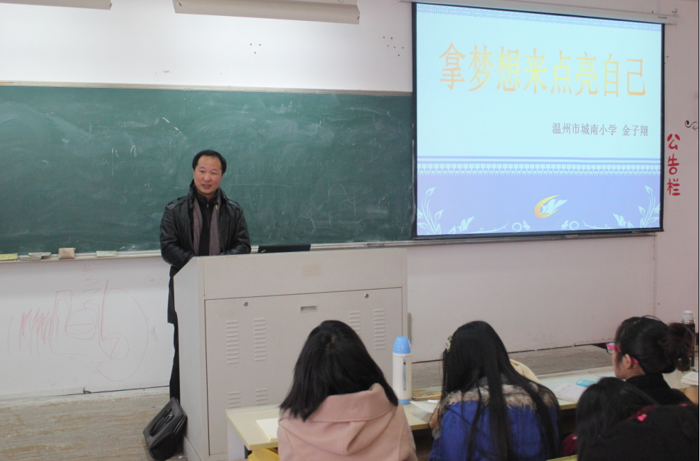 2012年12月12日,温州市城南小学校长金子翔老师在北校区教育楼301教室为小教系10级的同学开展了以“拿梦想来点亮自己”为主题的讲座。看到满场充满活力的大学生,金校长十分激动,并回忆起自己上大学时的情景。他一直相信:人生是一个圆梦的过程,我们要不断播种梦想,保护梦想,最终才能圆梦。