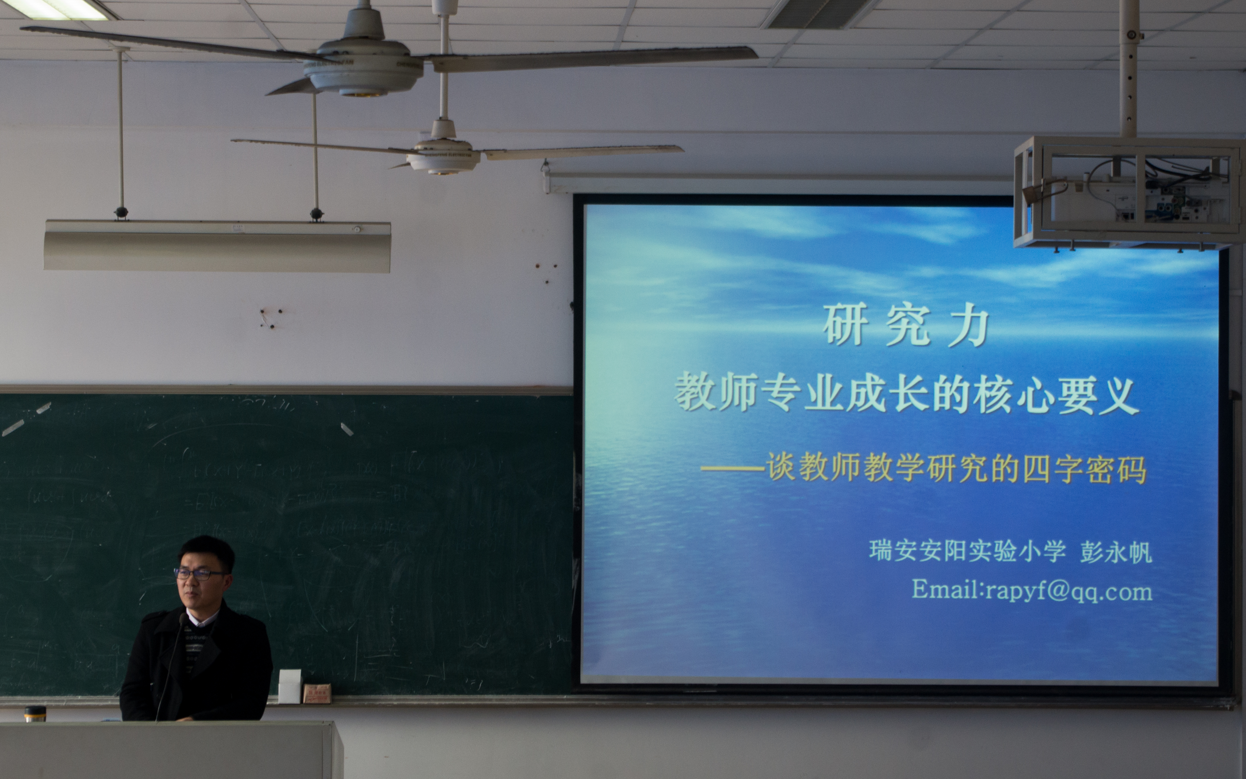 为帮助同学们深入了解教育教学研究策略,促进同学们的专业成长, 2013年12月4日下午一点三十分,williamhill官网小教系于北校3号教育楼401教室开展了名师大讲堂活动。本次讲座的主讲人由瑞安安阳实验小学副校长彭永帆担任,主题为“研究力:教师专业成长的核心要义”。本次活动由小教系主办,小教工作室承办,小教系谭莉老师主持。