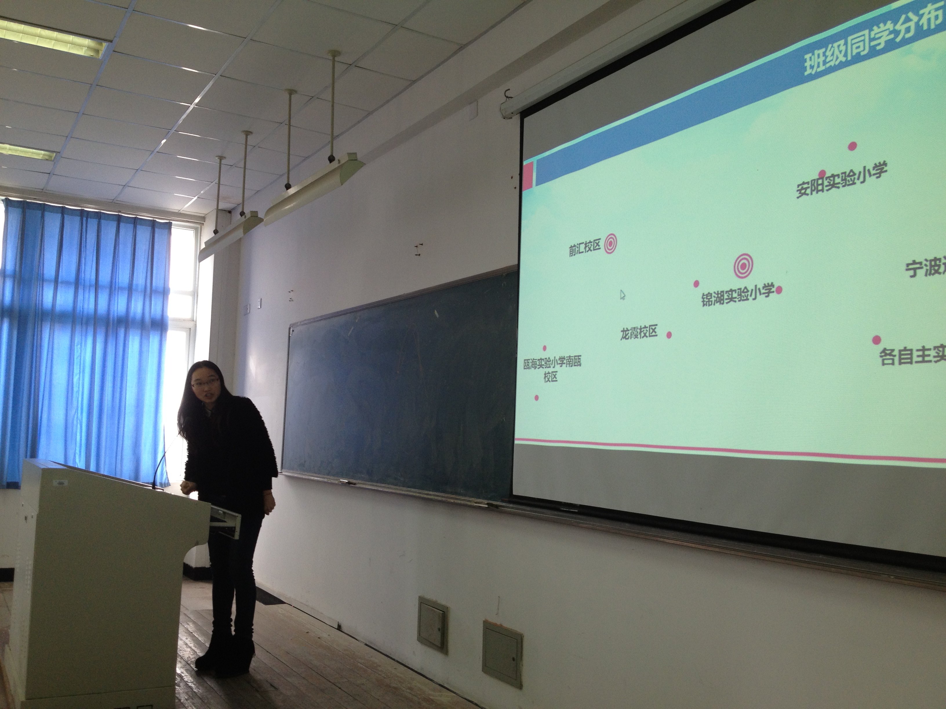 首先,张红叶同学代表科学班,分别从科学班实习的概况、对科学教学的思考以及遇到的班主任工作难题三个方面向大家讲述了自己的体会与收获。其中,她还利用了照片和教学视频片断,向大家展示了科学课中的实验设计。随后,数学班的张凯莉同学结合自己在实习中的经历,主要讲了课堂气氛调控、数学教学技巧、问题学生教育方面的一些感悟。另外,她还与大家分享了自己上公开课所收获的经验,并鼓励同学们要在以后的教学中敢于尝试、敢于创新,积极地向名师看齐。第三个进行总结汇报的是中文班的代表温梦婷同学。一方面,她从新班主任工作要点出发,向大家介绍了星级管理制度、班级活动开展的有关内容;另一方面,她从语文教学出发,总结了中文班同学在略读课教学、作文教学中的一些体会与经验。