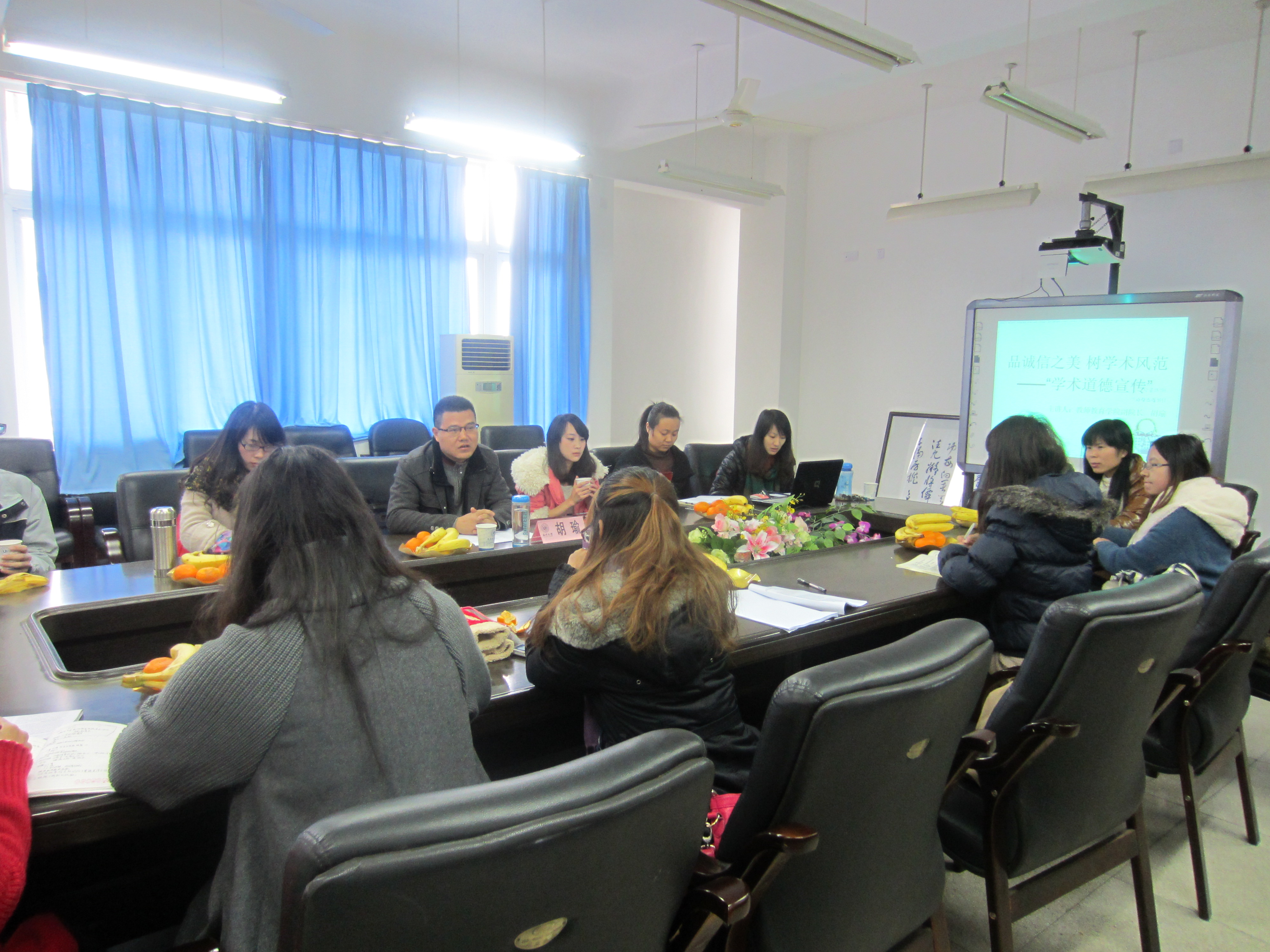 为了促进研究生形成正确的学术道德观,树立严谨的学术精神,我院于12月13日上午10:00在北校3-311会议室举行以“品诚信之美,树学术风范”为主题的学术道德宣传专题讲座,由我院副院长胡瑜老师主讲,同时参加本次讲座的还有我院研一研二的全体学生。