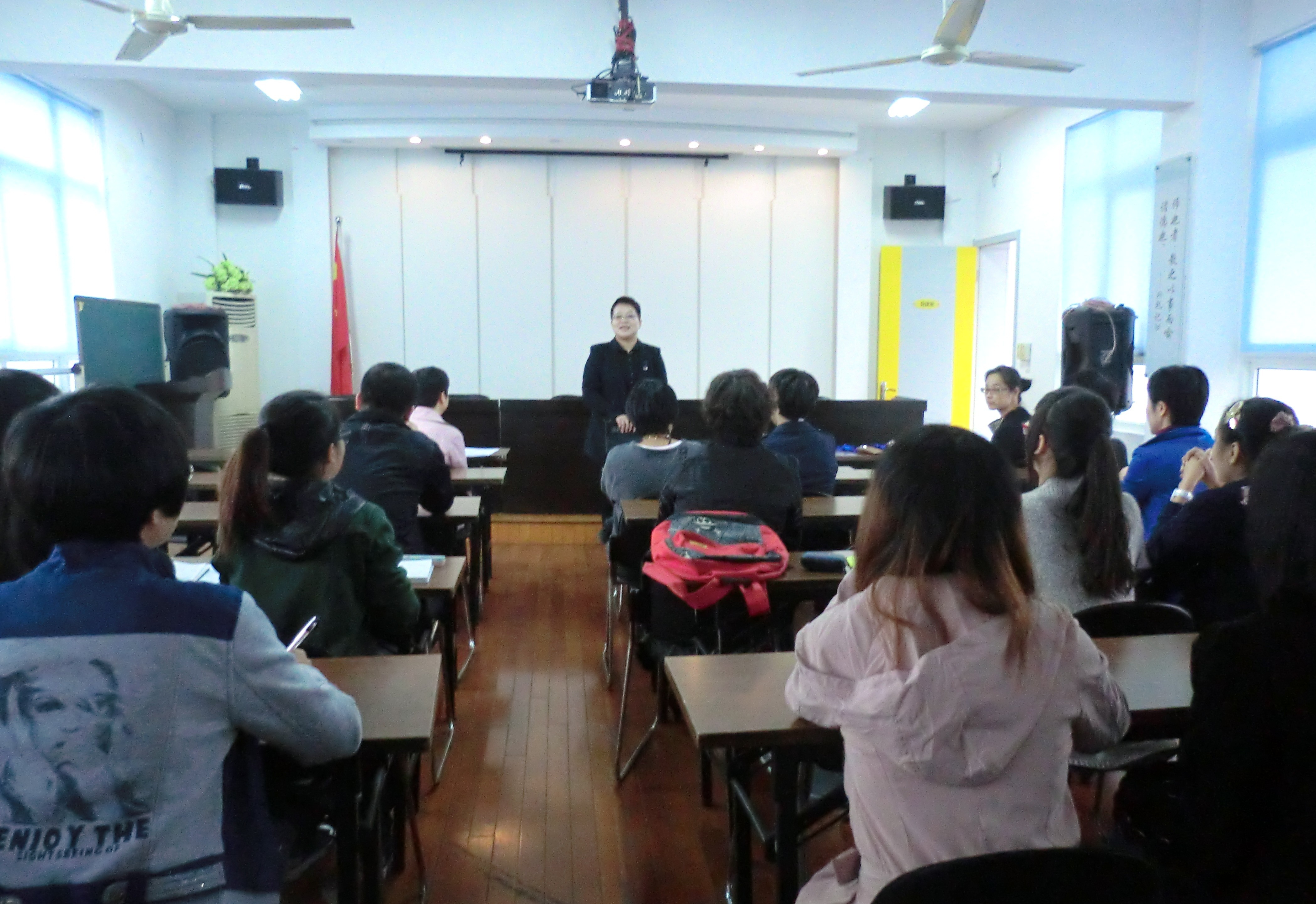 接着是校区教导主任张老师的发言。张老师首先介绍了各班的任课教师,然后大致说明了见习两周的计划:第一周主要是全部见习生集中听课,平均一天3节课,一周共12节课;第二周见习生分班听课和上课;最后,张老师还特意说明了见习生的午餐等细节问题。