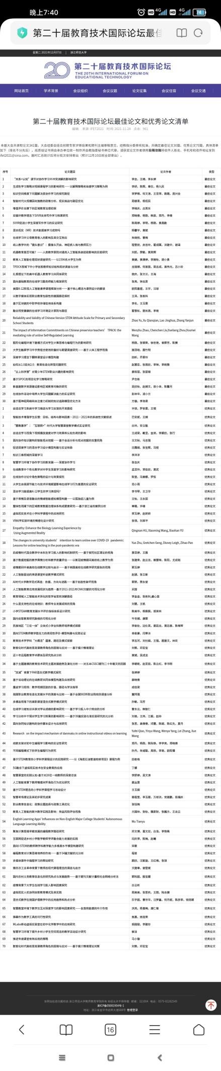 11月27-28日,第二十届教育技术国际论坛(IFET2021)由教育部高等学校教育技术专业教学指导分委员会主办,由William威廉williamhill、浙江师范大学williamhill官网、浙江工业大学教育科学与技术学院、杭州师范大学经亨颐williamhill联合承办,以及《电化教育研究》《中国电化教育》《现代教育技术》《中国远程教育》《开放教育研究》《远程教育杂志》《现代远程教育研究》《现代远距离教育》《Sustainability》等专业学术期刊共同协办,在浙江师范大学隆重召开。。本届论坛的主题是“技术赋能教育高质量发展”,受到了学界广泛关注,投稿数量和汇报数量均创历届会议新高,会议期间吸引了6万余人参与线上直播。