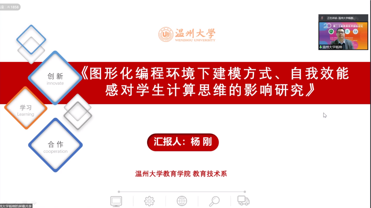 在编程教育与计算思维专题,我校杨刚教授分享了《图形化编程环境下建模方式对学生计算思维与编程行为的影响研究》相关经验和成果,郑丹、张银荣、徐佳艳、王欧、郭婷婷、陈际焕同学也分享了丰富的论文经验。在AR/VR教育应用专题,我校郑晓倩、蔡薇薇同学分享了《双循环教学理念下SVVR支持写作学习效果研究》和《虚拟现实技术在课堂教学应用的特征分析与思考》的相关论文知识。在基础教育信息化专题,我校李倩倩、孙倪明同学分别分享了《情境交互式电子书对大班幼儿空间能力影响的实验研究》和《儿童双语绘本的“数字化”开发与交互运用研究》的相关论文知识。在Steam教育及教师发展论坛,陈美华、李丹青同学分别分享了《小学STEAM教育发展水平评价指标体系设计研究》和《国内外STEAM教学模式比较研究》的相关论文知识。在教育人工智能与教育伦理专题,李倩同学分享了《我国近十年人工智能教育研究热点》的相关论文知识。