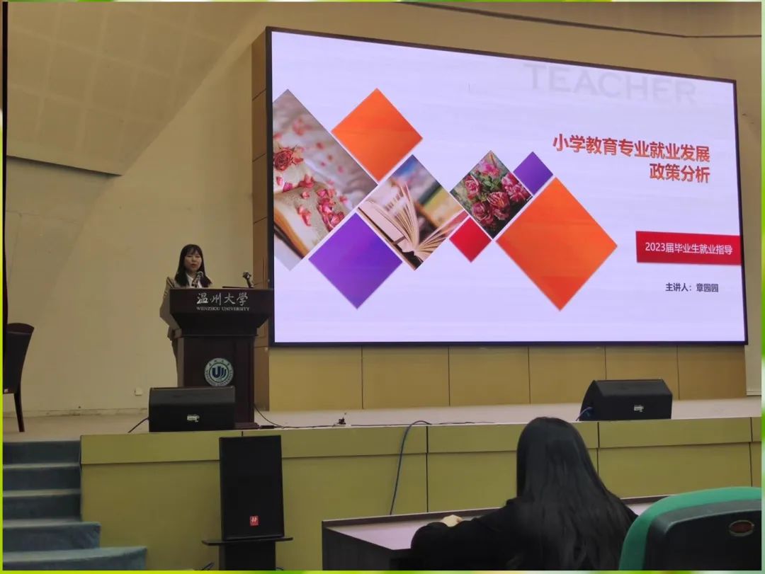 章园园书记从近三年我院小学教育就业发展数据、简历的撰写和提前批面谈与结构化的准备三方面为我们展开讲座。在当前的就业大环境下,同学们的就业情况受到地方政策、疫情背景和就业者个体等多方面因素的制约,因此章书记鼓励毕业生不断精进自身师范技能,把握每次求职机会。此外,章书记还以切实的求职面试经历为切入点,为同学们清晰地阐明了接下来的努力方向。