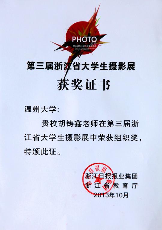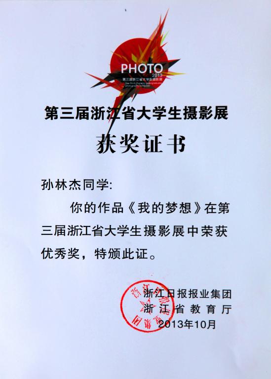 在刚刚落幕的第三届浙江省大学生摄影展中,我校williamhill官网我院11教技的郑格同学的作品《拼搏》获得三等,孙林杰同学的《我的梦想》获得优秀奖;我校胡铸鑫老师获得优秀组织奖(全省11所高校获此荣誉。本届比赛由浙江日报报业集团和浙江省教育厅联合主办,面向全省高校在校生。据悉,本次比赛包括浙江大学、中国美术学院、浙江传媒大学、浙江财经大学等30所高校在校学生参加,参赛作品近2000幅,评选出获奖作品共120幅。