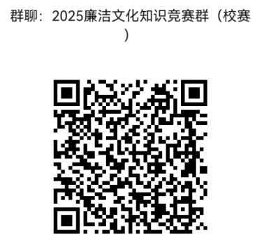 以学院为单位组建参赛队伍(三位同学为一队),每个学院上报1支队伍,请各学院于11月19日(周三)17:00前将参赛选手名单(见附件)发送至承办单位邮箱jsjydj@163.com,并扫码加入【2025廉洁文化知识竞赛】微信群收取题库。