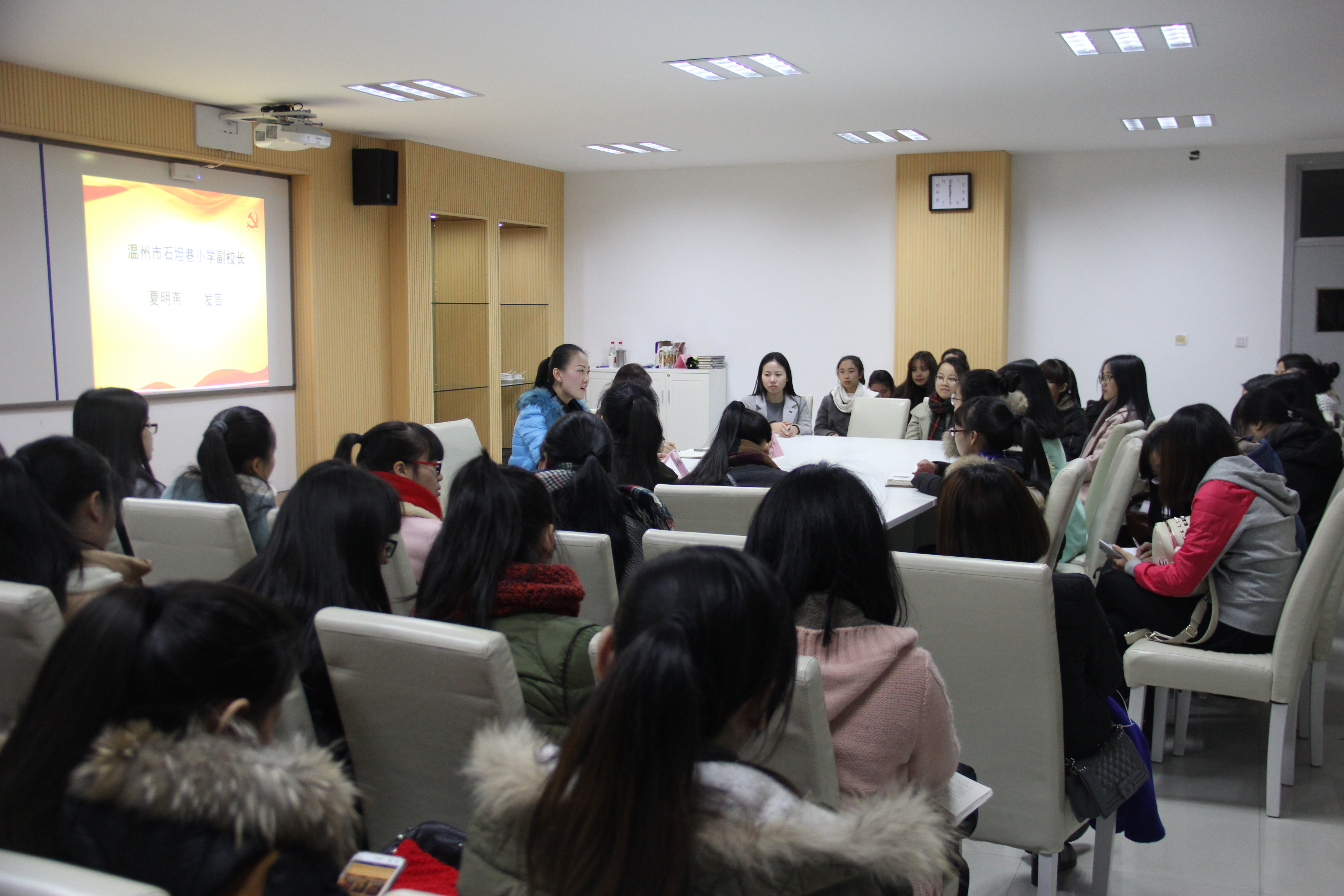 夏明燕老师现任温州市石坦巷小学副校长,毕业于温大,作为一名优秀校友,她与我们分享了自己在教师成长之路上的点点滴滴。首先,她摆出了自己对教师这份职业的态度。任何职业只要你有决心做好,就能够成为该领域的佼佼者。这一观念相信在场的毕业生已经深入内心。随后,夏明燕老师开门见山地提出了“如何管理孩子”的问题,大家都提出了自己的看法。老师用自己的经历解答了这个问题,关爱以及适当的严厉能够取得不错的效果。另外,针对毕业生的现状,老师也提出了自己的见解。确实,对于即将毕业的学生,这段时间是迷茫甚至无措的。此时,老师的一些建议能带给她们一些光亮。到了大学的终点,社会的起点,坚持是十分重要的。而现在,“做好眼前的事,干好眼前的活”,努力的人总是不会有错。如何去做,大概是大家都想问的。所以,老师提出了一下几点。一、珍惜毕业班的机会,因为每一次培训都是福利。二、让备课成为一种习惯。机会总是留给有准备的人,拥有自己的想法会让你脱颖而出。三、把每一次课堂教学当做练兵。总结经验,不断提升课堂质量。