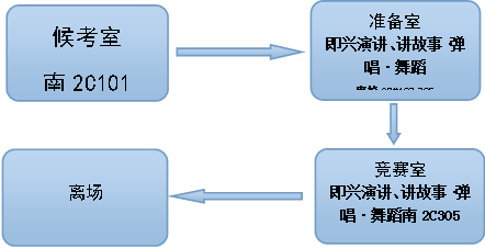 所有选手请于16:30前进入候考室(全程通讯设备禁用),按竞赛秩序表顺序领取竞赛试题进入各自准备室每人准备40分钟,最后到竞赛室进行竞赛,每位同学竞赛顺序按即兴演讲-儿童故事-儿童歌曲弹唱-儿童舞蹈表演的顺序进行,每人竞赛时间为5分钟。