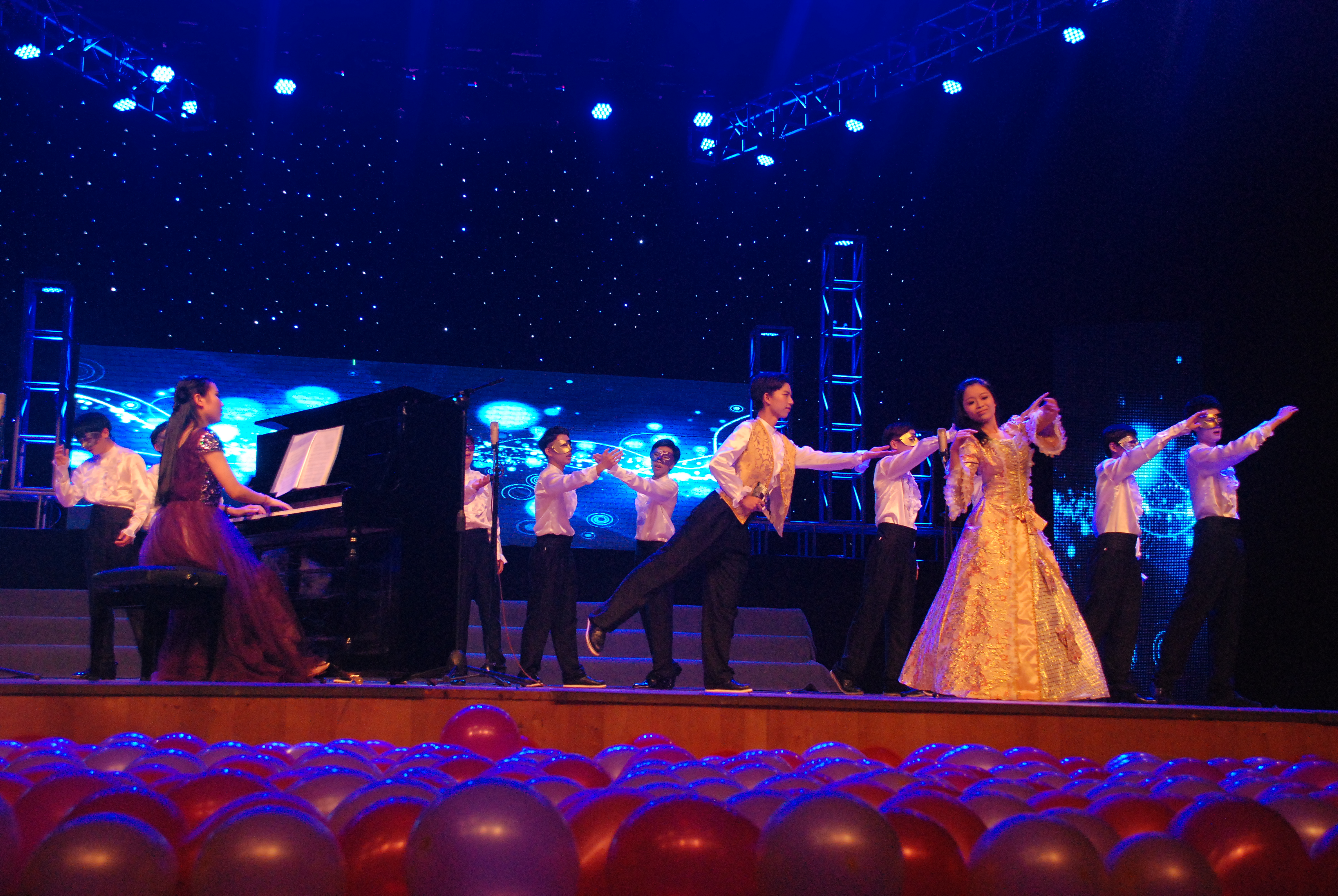 除此之外,郑诗柔,徐以迦两位同学强强联手,给大家带来了钢琴四手联弹《G小调第一号匈牙利舞曲》,在时而欢快,时而舒缓的音符下,同学们的心情也随之起伏。学前乐清教点的学弟、学妹们也带来了精彩的节目,一群带着面具的、神秘的男生唱着《悄悄的、悄悄的》,一位年长的“奶奶”带着活泼的捕鱼姑娘,翩翩起舞,他们精彩的表演引得阵阵掌声。11应心的罗余军,用他那浑厚的声音,张弛有度的朗诵带大家领略了黄河河床的伟岸,收获了全场观众的喝彩,掀起了又一次高潮。最后,作为压轴的女生合唱团,带着《丹顶鹤的故事》、《李有松》给大家来了一场听觉上的盛宴。