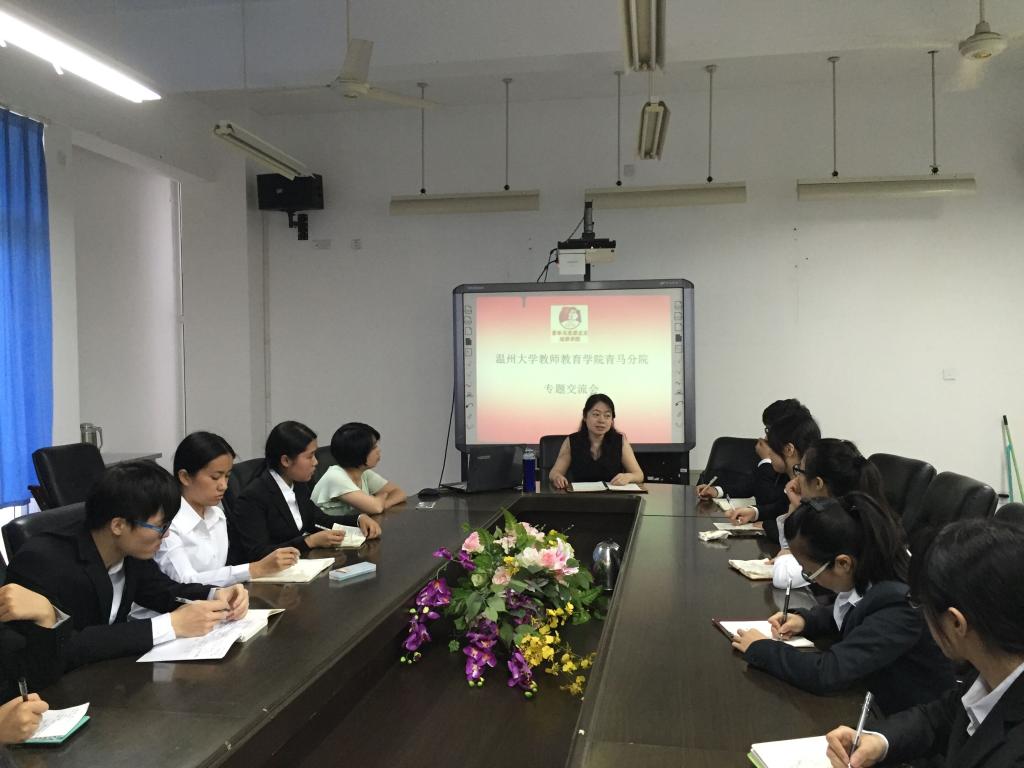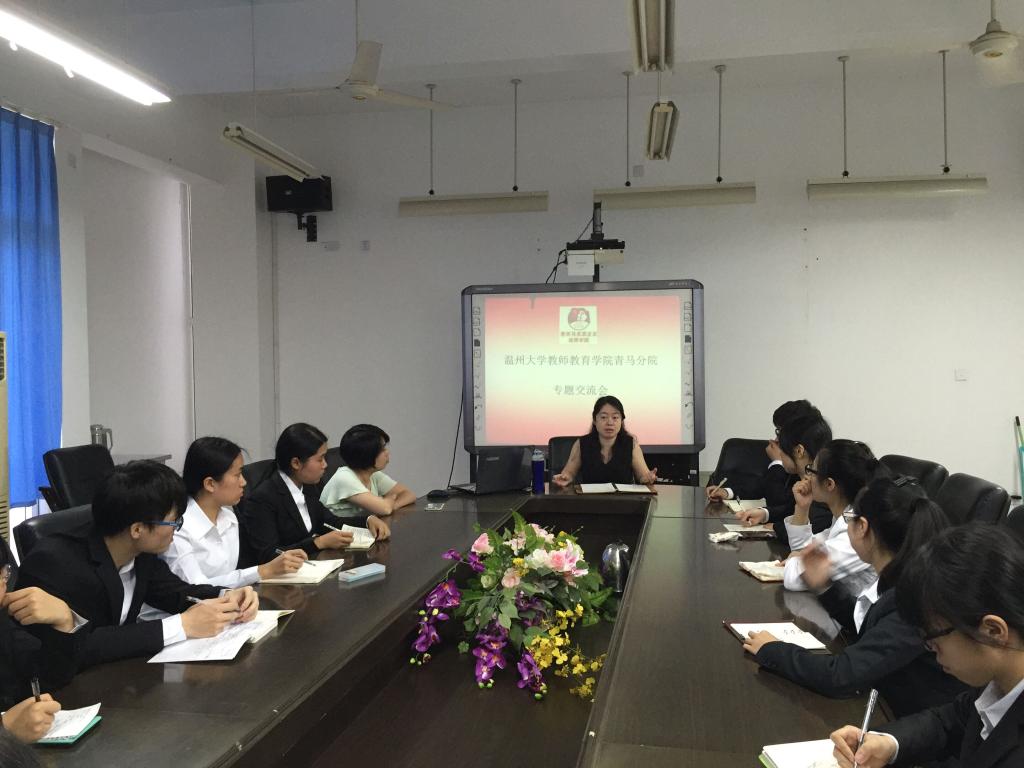 2015年6月3日17点,williamhill官网青马分院专题交流会在北校3号楼311顺利召开。出席本次交流会的有williamhill官网党总支副书记嵇小怡老师,学生科副科长陈秀雅老师和williamhill辅导员严晓秋老师,以及williamhill青马一期所有成员。