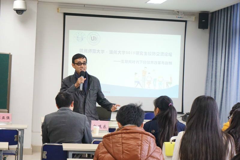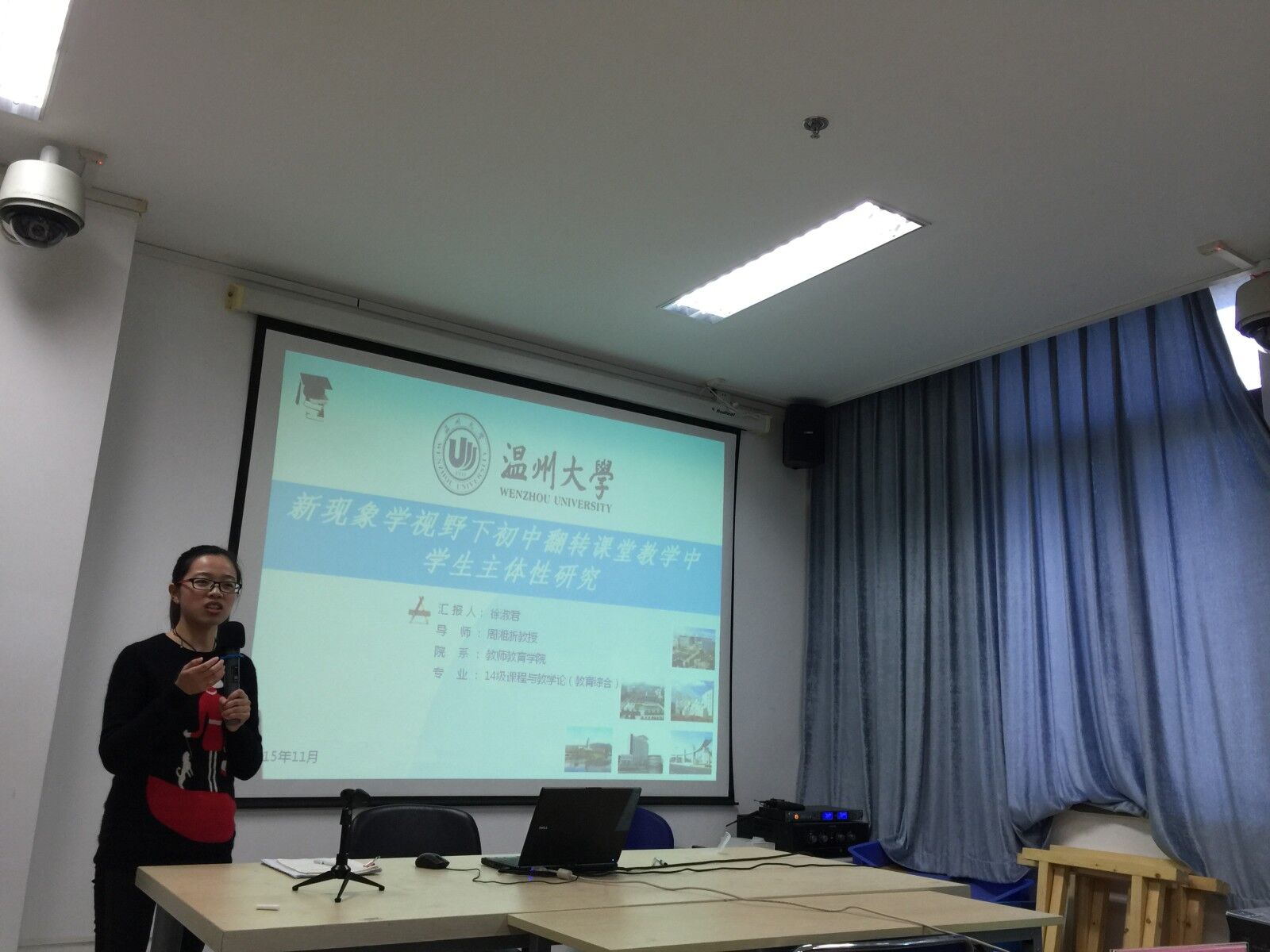 此次校际交流论坛由我院研会主席王庆超与杭师大williamhill研会主席姜霞主持。会议伊始,杭师大仲玉英院长致欢迎辞,折延东老师对温杭校际交流会的历史渊源做简单介绍并预祝此次交流圆满成功。会中,双方研究生依次交流了各自关注的学术问题,新颖独特的研究视角、丰富多样的研究内容以及汇报同学激情澎湃的论述、台下同学踊跃的提问质疑,无不吸引着与会者的眼球,会场学术氛围甚浓。师生们从研究内容、研究方法、研究视角、应用前景等方面聚集互联网时代下教育的改革与创新。会议在徐淑君同学的“新现象学视野下初中翻转课堂教学中学生主体性研究”中步入高潮,张华老师从跨学科意识、鲜明的问题意识、创造的意识三方面对此研究给与较高的评价与肯定,同学们也纷纷赞同。这让我们对互联网时代下教育的改革创新与跨学科的研究意识有了新的感悟与收获。