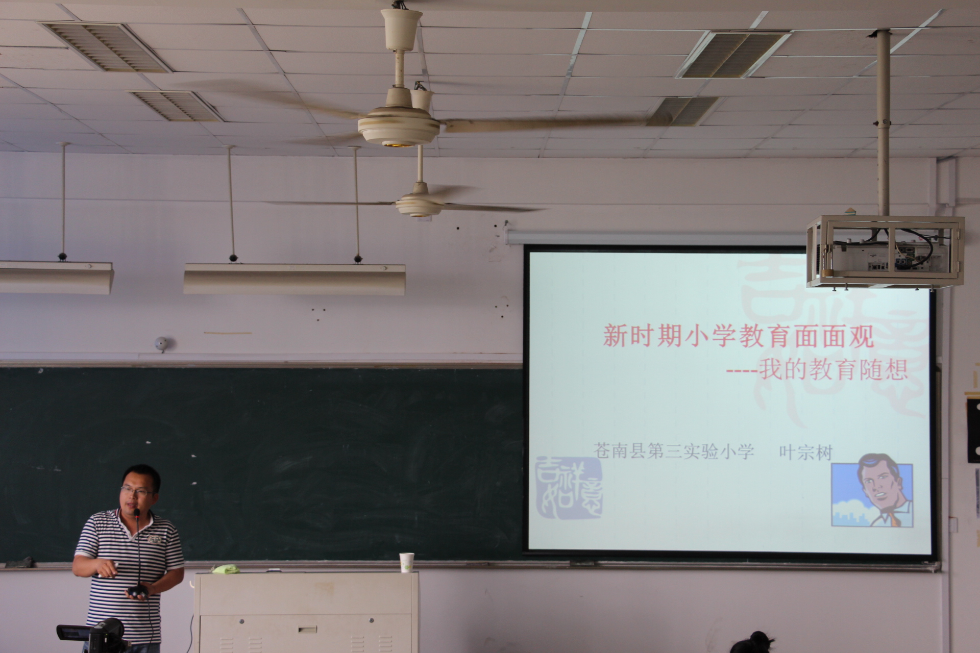 2015年5月20日下午13:30,williamhill官网在北3-302召开了名师大讲堂活动。本次活动邀请到了温州苍南县第三实验小学叶宗树老师,讲座主题是:新时期小学教育面面观。活动由小教系主办,小教工作室承办,谭莉老师主持。出席本次活动的有13级小教全体同学。
