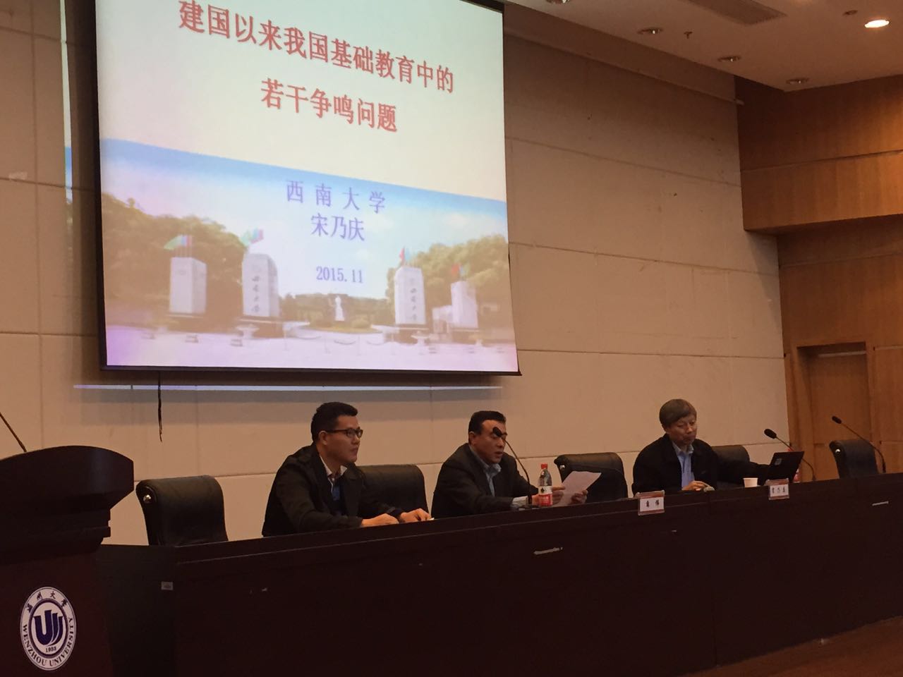 2015年11月13日上午,应我院邀请,西南大学博士生导师宋乃庆教授来William威廉罗山讲堂作了题为《建国以来我国基础教育中的若干争鸣问题》的学术报告。参加学术报告的对象有温州市“十二五”第四期校长班学员,以及我院部分教师与本科生、研究生,此外还有温州教育界的各级同仁。报告由薛伟副校长主持。