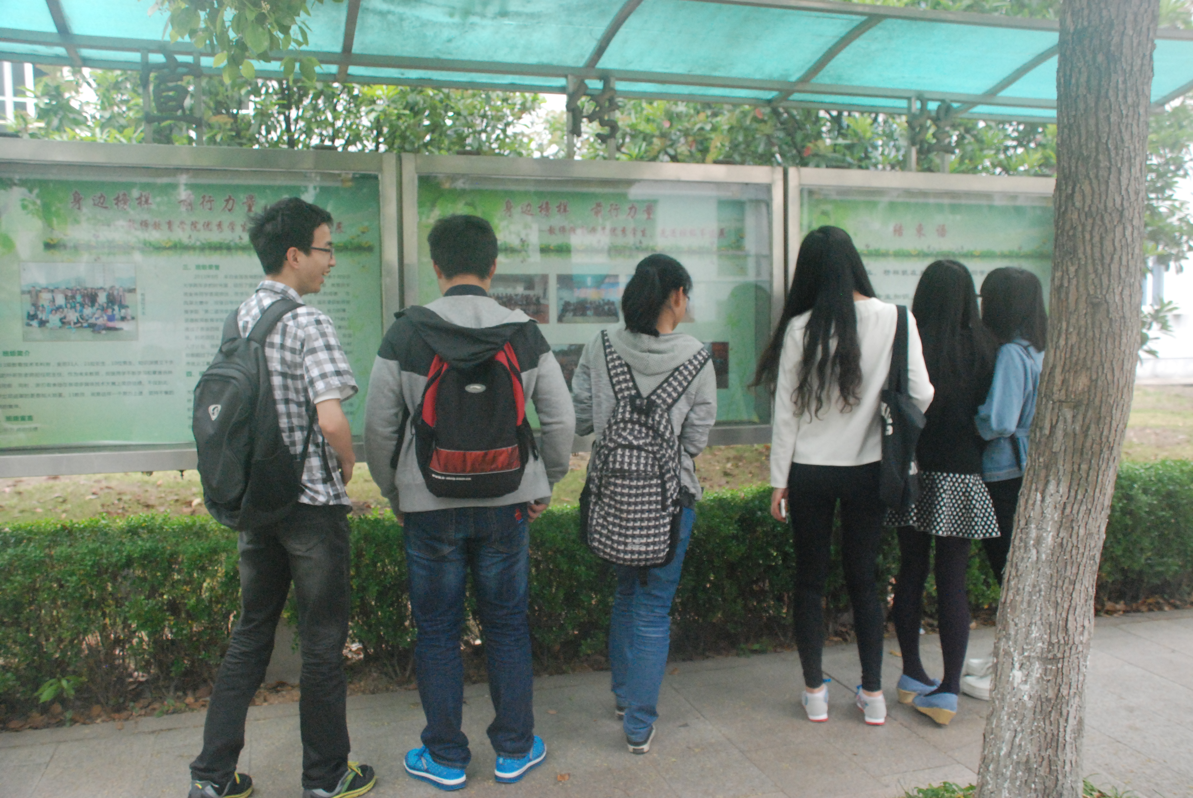 本次展览通过图片加文字的形式在北校宣传橱窗展出了我院17位优秀学子及3个优秀班集体的先进事迹。展出内容主要包括参选者的基本信息、获奖情况、主要事迹、教师评价等。不难发现,在这批优秀学子的背后都有着共同的特质:在“博”上,他们有着充沛而旺盛的求知欲,有着博大和宽容的胸怀,有着对知识广泛涉猎的渴望;在“爱”上,他们有对社会、对学校、对未来的教师事业有着无私奉献的心;在“雅”上,他们温文尔雅,不焦不躁,拥有豁达与开朗的生活态度;在“艺”上,他们与时俱进,创意无限,具备扎实的师范技能。本次展览引来了不少师生在宣传橱窗前驻足观看。一位高年级学生不禁感叹道:惭愧啊,人家两年所获得的荣誉比我四年还要多。