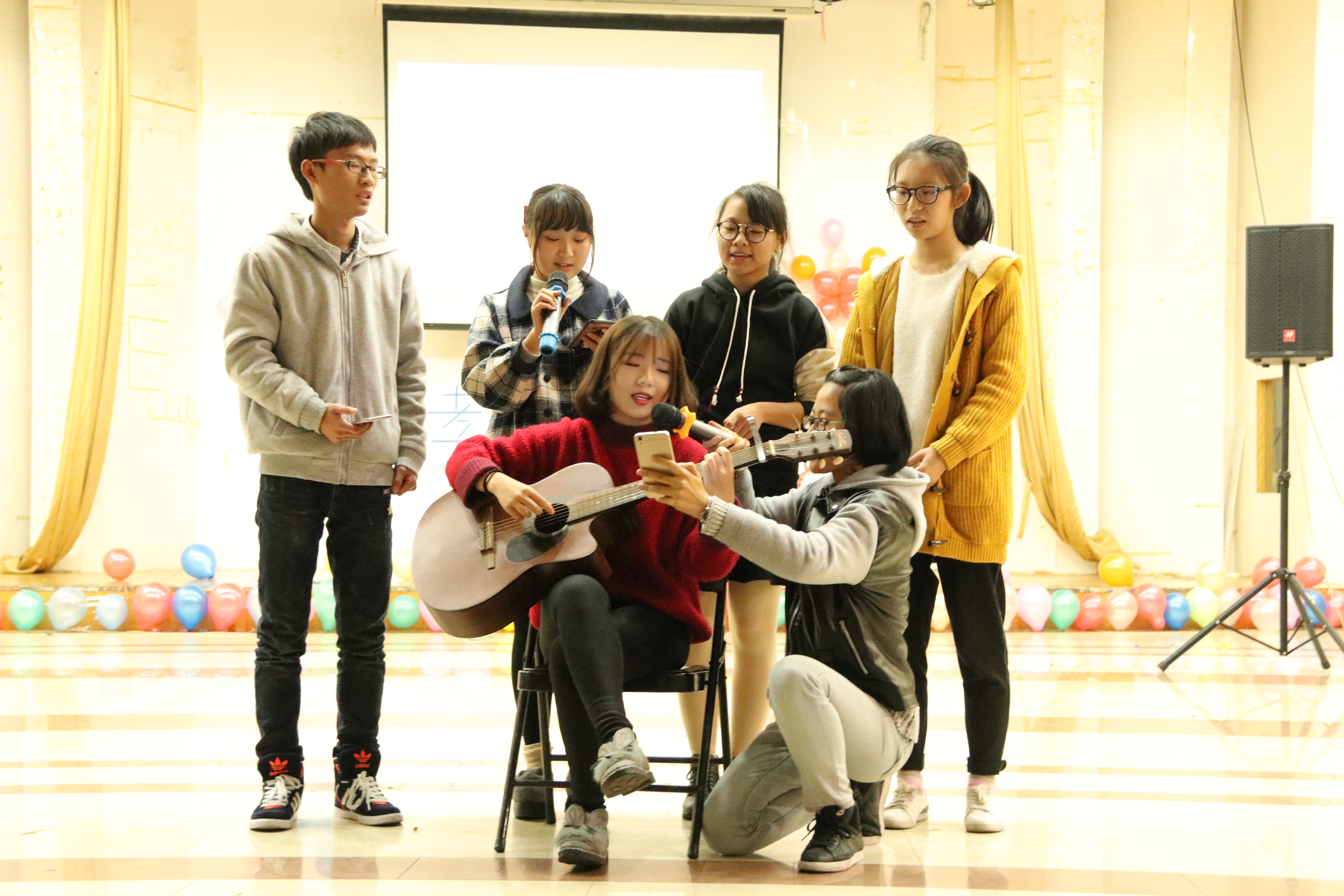 在活动期间,杨立淮书记向同学们表达了新年的问候,对同学们的付出表示感激。随后,林萍老师,严晓秋老师,杨丽君副书记也陆续一展风采,上台演唱歌曲,与全场一起庆祝,一起快乐。杨丽君老师希望大家能够学得high,干得high,玩得high。