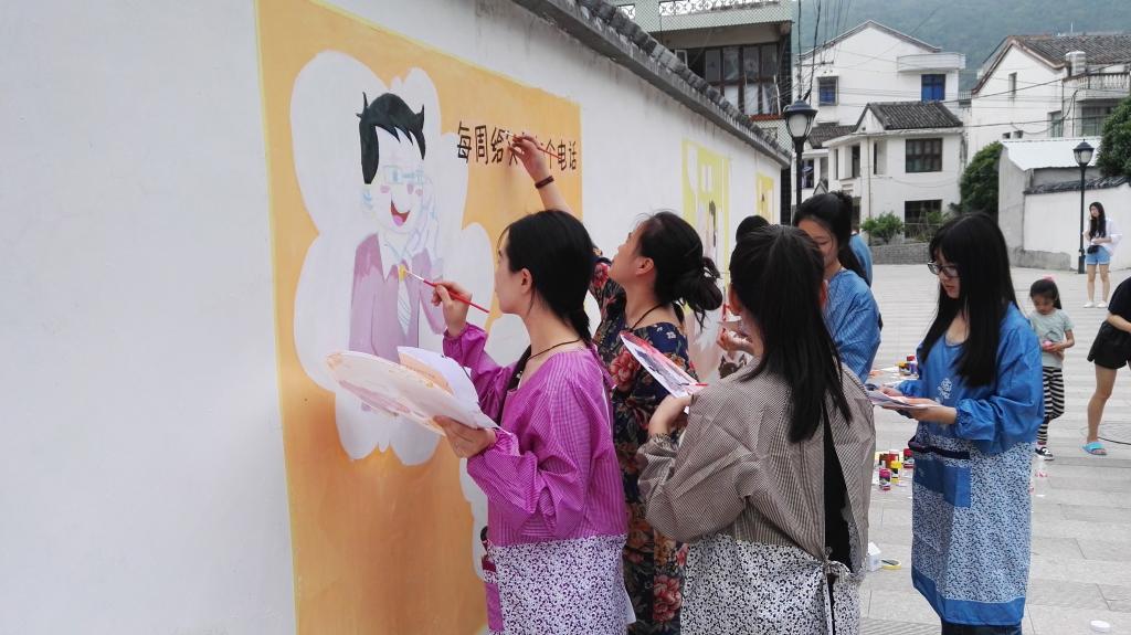 公益墙属于大乌石村中心休闲街外墙,村委会改造后重新粉刷。志愿者现场测量墙面尺寸,在空白墙面前纷纷进行排版设计和图绘勾画,进行长达5小时孝文化系列的绘制,得到当地村负责人的肯定和村民的赞许。