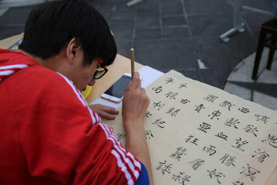 参赛选手有序地进行现场书画比拼,同学们围绕纪念中国人民抗日战争暨世界反法西斯战争胜利70周年,中国梦·我的教师梦,“博、爱、雅、艺”师范气质,迎省大运会、展学子风采等主题,自由发挥,在宣纸上挥毫泼墨,在画纸上尽情挥洒。林元况老师为同学们现场展示,他那遒劲有力的一撇一捺,淡然自若的风姿,翩若惊鸿、婉若游龙的书法作品,都让现场的同学们感受到了书法的博大精深,令大家赞叹不已。陈铿老师为同学们现场指导,陈老师寥寥几笔的加工瞬间使画里的事物栩栩如生,让现场的同学们深知美的艺术只有在勤奋的基石上才能荣耀绽放,更加坚定了对中国文化的信心与期望!