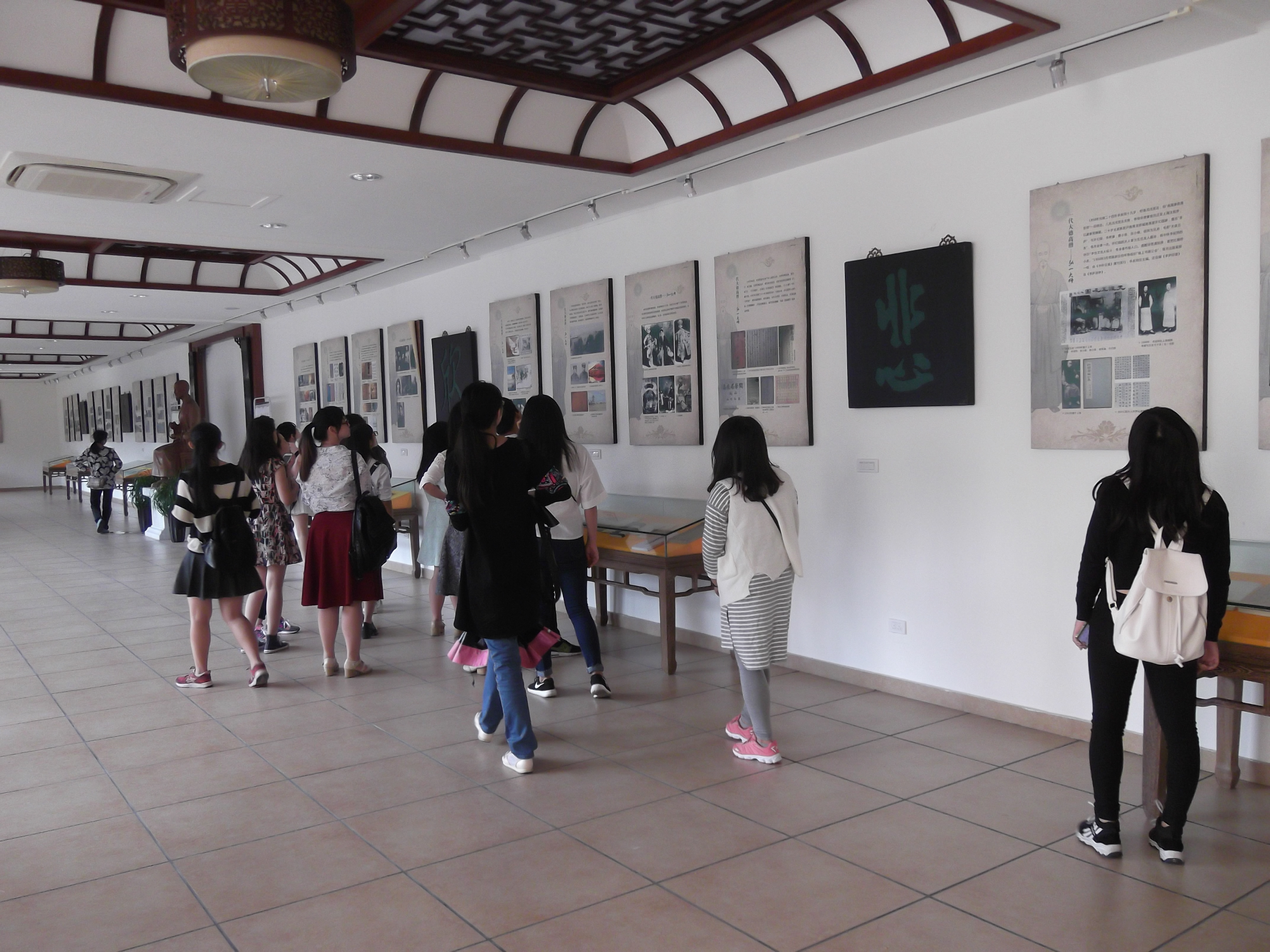回程路上经过弘一法师纪念馆,虽然错过了原定的开放时间,寺庙中的大和尚和善地为我们开了门。弘一法师风骨清雅,绝世出尘,展出的书画作品也令同学们眼前一亮,揣摩良久。
