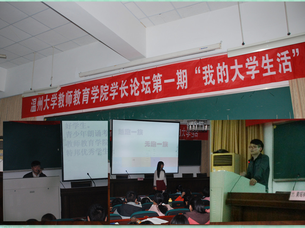 在此次讲座中陈占挺学长提出了"我的大学我做主"的观点,继而从自我丰富大学、坚持梦想、贵在坚持、学习规划、学会圆梦"这五个方面向我们同学讲述了他的大学生活,更提出了一些宝贵的建议。黄惠学姐提出了"我还可以这样活"的看法,并做出越趣一族、无趣一族、有趣一族的分类,强调活在当下的重要性。黄瑶驹学长则提出"学长的感悟",更从职业规划、人际交往、自我完善、感恩、遗憾、恋爱、总结这七个方面进行阐述。
