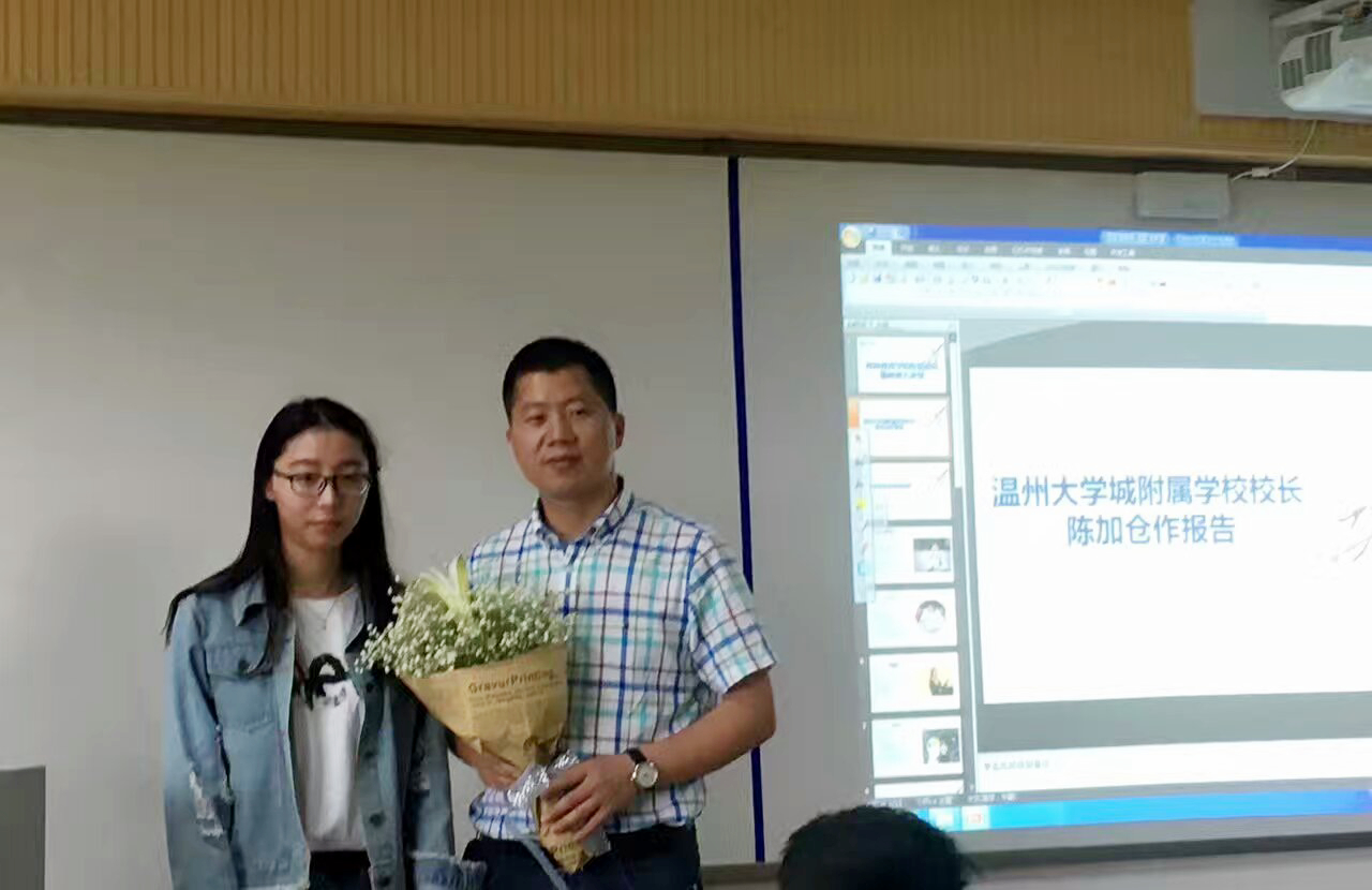 第一位作报告的校友是陈加仓校长, 陈校长开门见山,他的主题是“当老师,学生喜欢,足矣!” 他首先向我们回顾了自己的成长历程,从一个农村孩子到特级教师再到校长,他的一路上有许许多多的故事。93年毕业,因为一杯椰子汁面试成功被录用,而后戏剧性的被学校安排当体育老师,几经波折终于教上了数学 最后还阴差阳错当校长。那一段的时光他最大的感受就是忙、累,到现在还记忆犹新。但他本人则说他从自己的人生中悟出的一句话是:人生就是痛苦的!这句话他深感其益,那年他被调入新学校,领导安排他给学校老师安排工作并做做思想工作,那一年,他还是个青年教师,体验了许多将来对自己记忆深刻的事,现在回想起来他说:人生幸福的事情,就是从一种痛苦转向另一种痛苦的那一瞬间。之后陈校长还与我们谈到了他所认为的成长的关键是什么,他说,高人指点、贵人相助、小人监督、个人努力 这四个中个人努力最重要,要想成功必须认识自己、认识自己的课做自己该做的事。陈校长诙谐幽默的讲话让在座的师生笑声掌声不断。