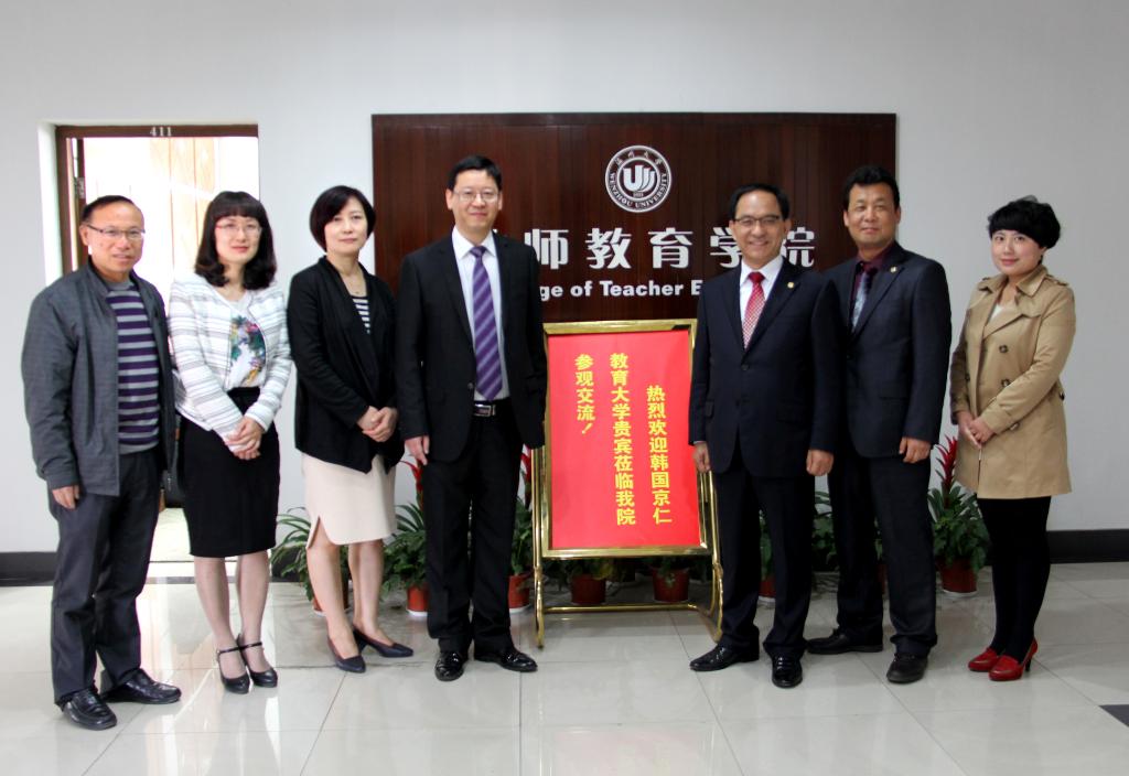 参观结束后,李在熙校长一行与我院领导又进行了亲切的座谈。郑信军院长代表学院致欢迎辞,并详细介绍了学院的学科、专业建设情况。李在熙校长也介绍了韩国京仁教育大学的基本情况。双方就小学教育专业的人才培养模式进行了积极的交流和探讨。