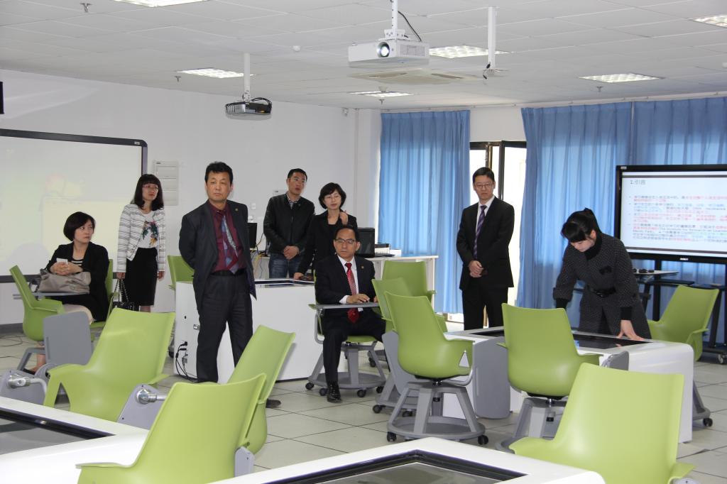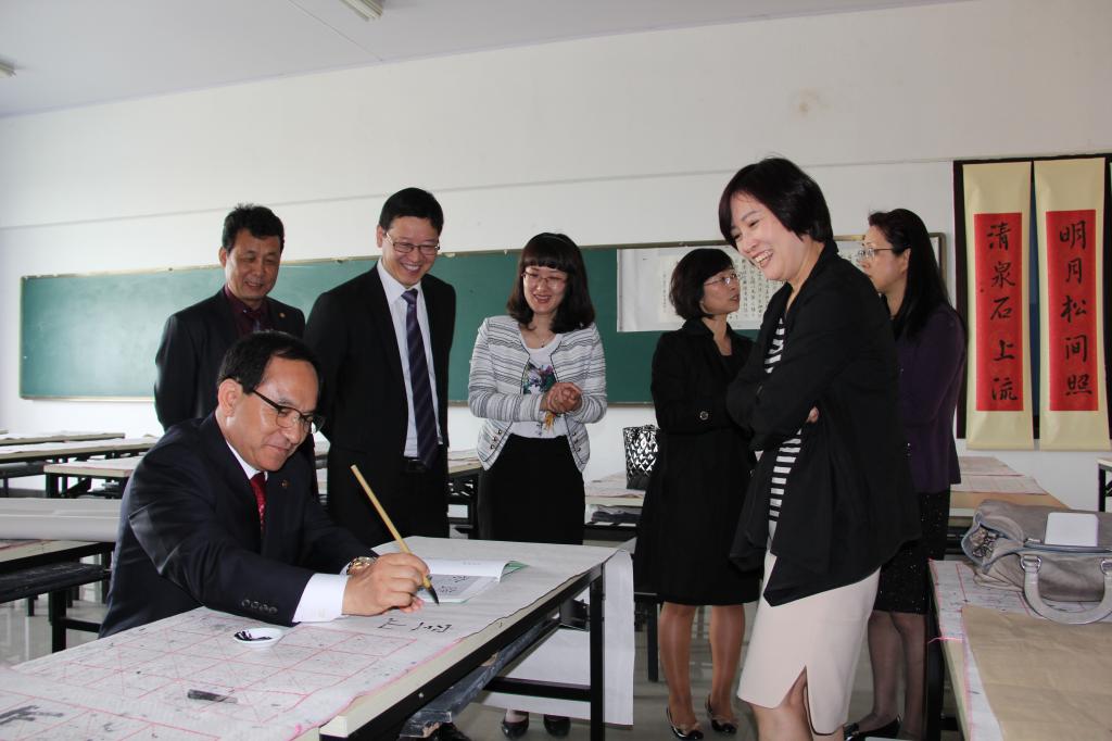 李在熙校长一行先实地参观了我院教师教育实验中心。在未来教室实验室里,韩国客人对未来教室先进的仪器设备和教育理念所吸引,并就未来教室的使用方法和未来设想展开了较为丰富的讨论和交流;在书法实验室,李在熙校长兴趣盎然,手握毛笔,挥笔写下“空山”二字。他们对实验中心精良的仪器设备和优越的教学环境颇为赞赏。