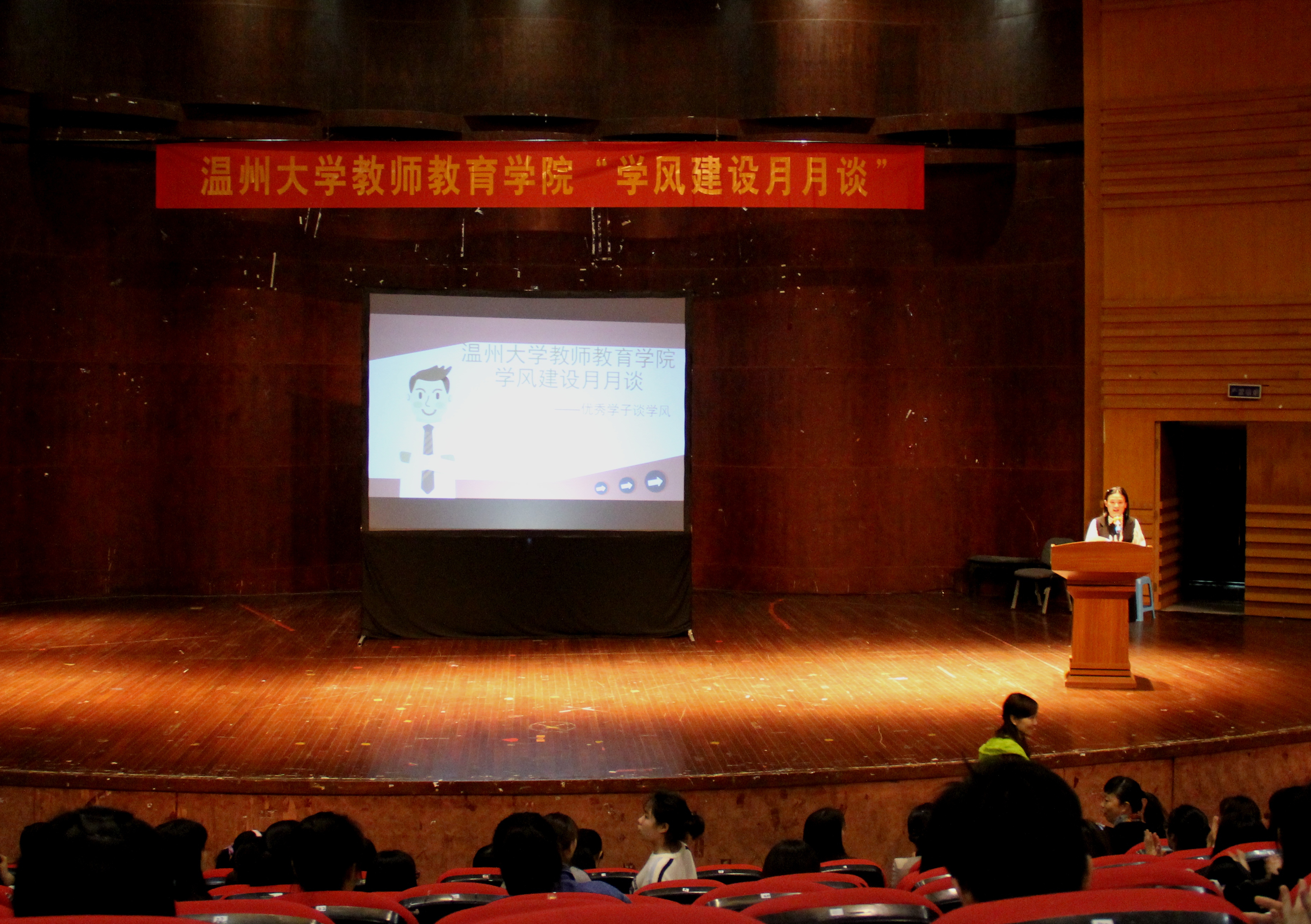 2016年4月6日星期三晚6时30分,williamhill官网“学风建设月月谈”主题交流会在南校音乐厅拉开了帷幕。党总支副书记杨丽君老师、学前教育党支部书记陈旭微老师、学生科副科长林萍,辅导员严晓秋、邵胜男老师出席本次讲座,到场嘉宾和优秀学生代表共议学风那些事儿。