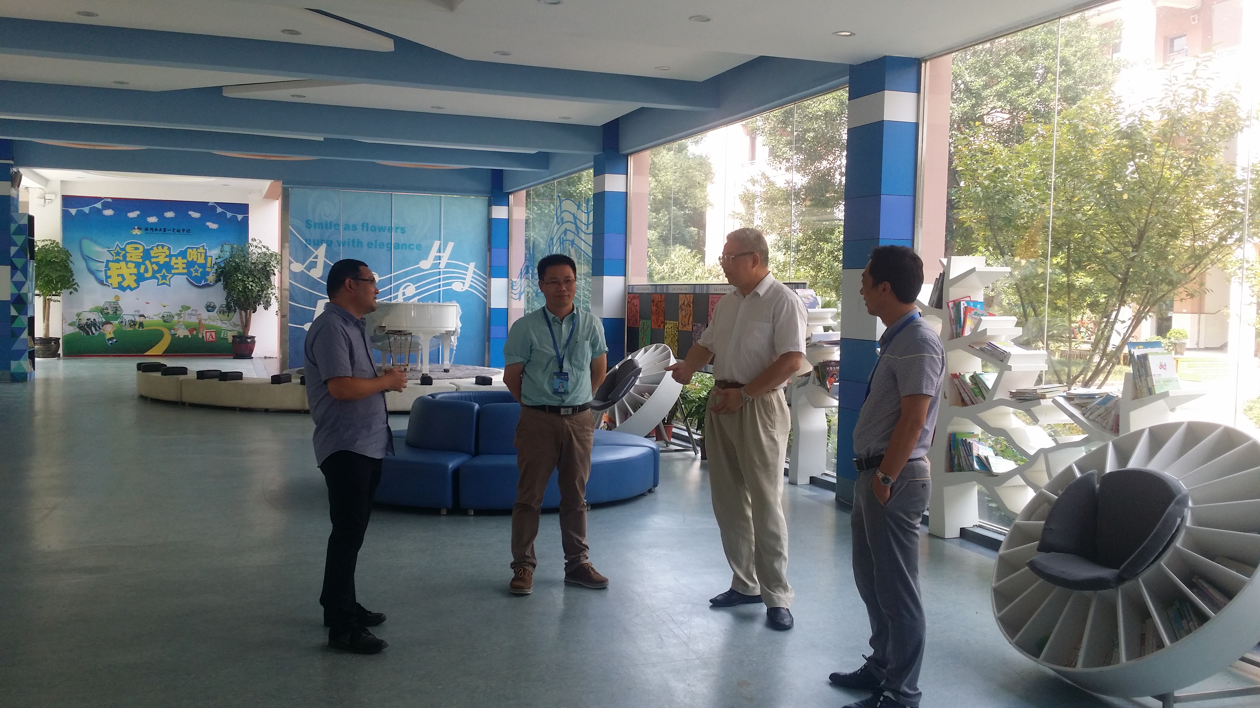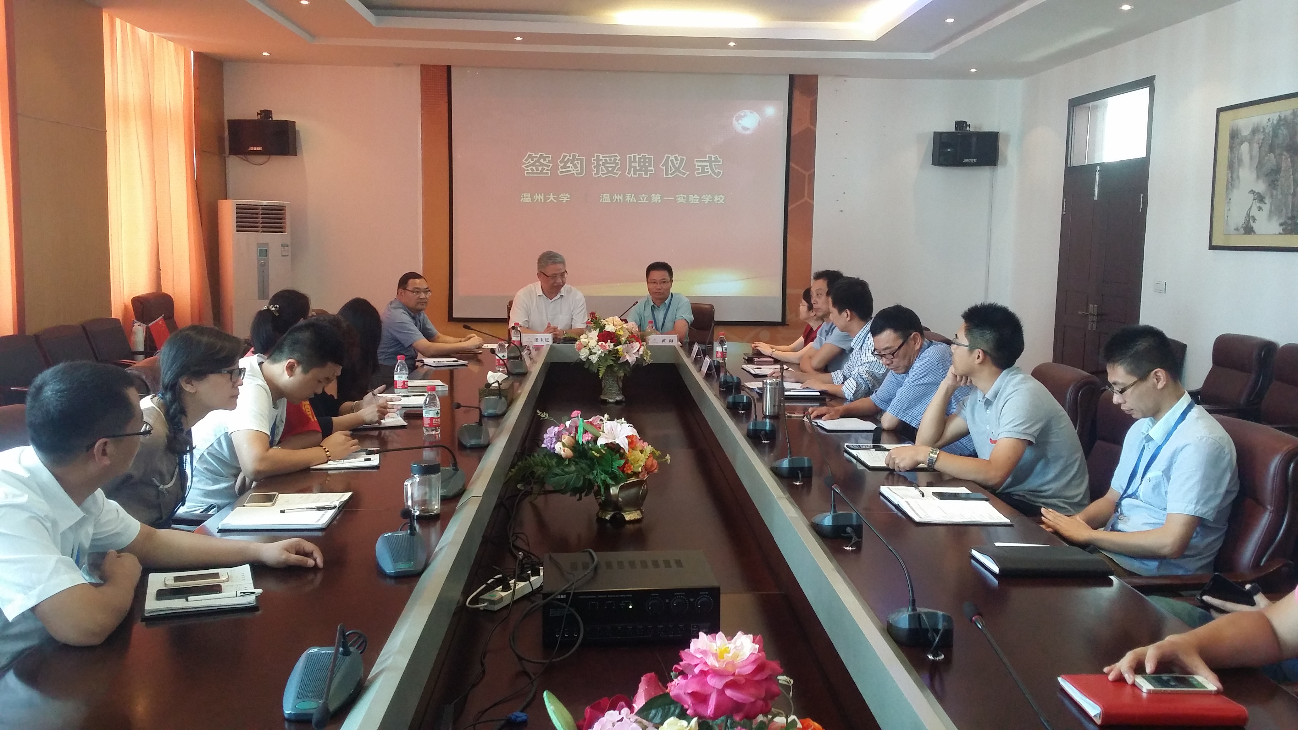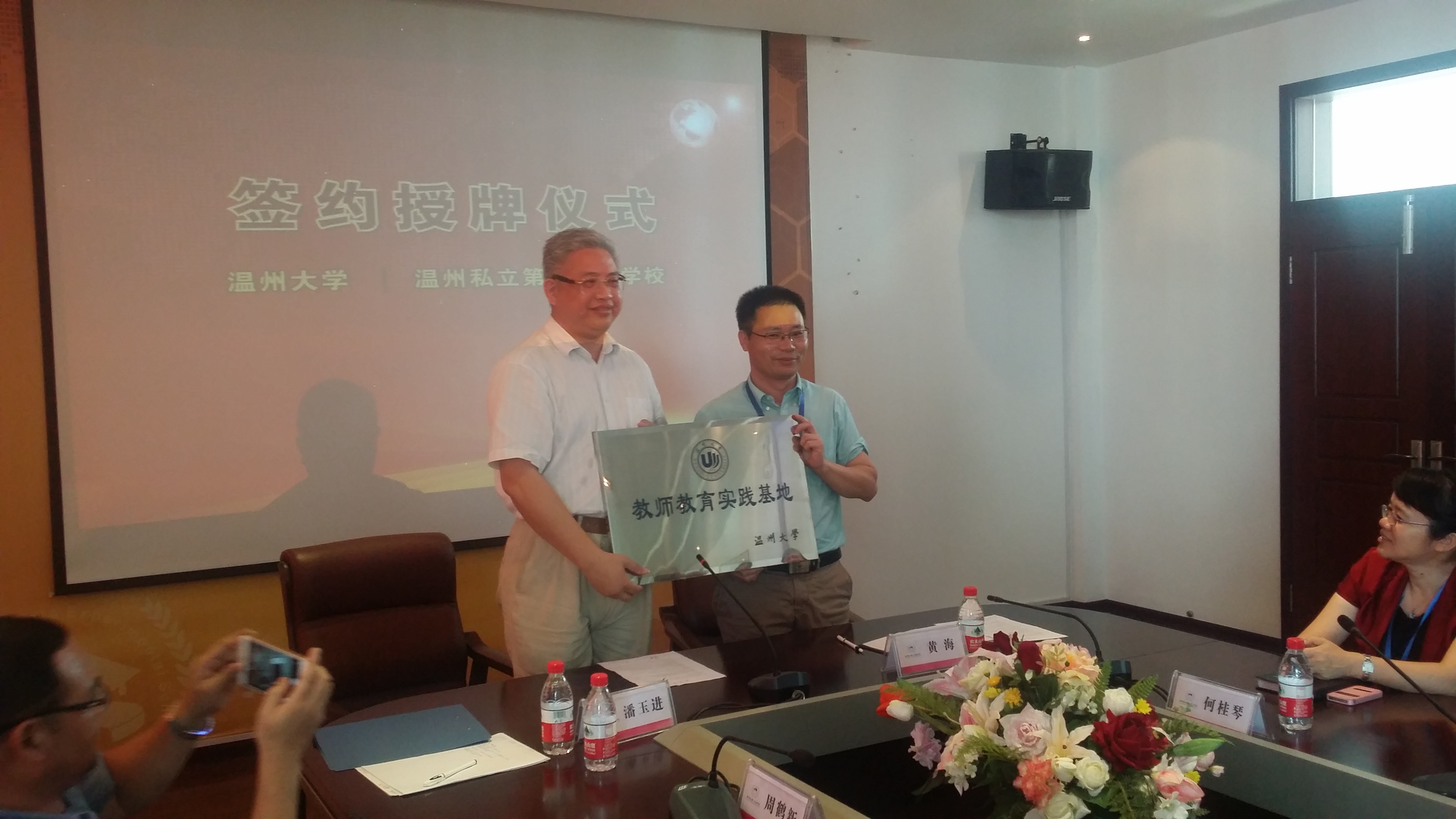 在温州私立第一实验学校四楼会议室,黄海校长为我们举行了隆重的签约授牌仪式,参加会议的还有该校何桂琴书记、谭修平副校长,教导主任庄老师等十几名学校领导、骨干教师。会议由庄老师主持。