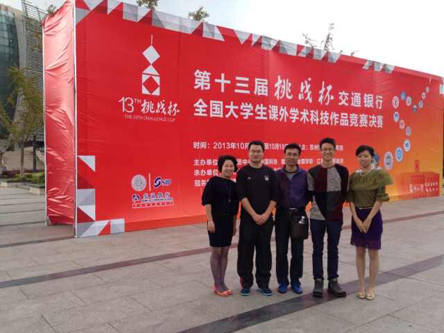 2013年10月13日至10月18日由共青团中央、中国科协、教育部、全国学联、江苏省人民政府主办,苏州大学和苏州工业园区管委会共同承办的第十三届“挑战杯”交通银行全国大学生课外学术科技作品竞赛决赛在苏州大学开幕。我校有三件作品进入终审决赛,四件作品进入现场展示。我院折延东教授、杨刚博士、方建文老师、陈秀雅老师、严晓秋老师等5人前往观摩学习。