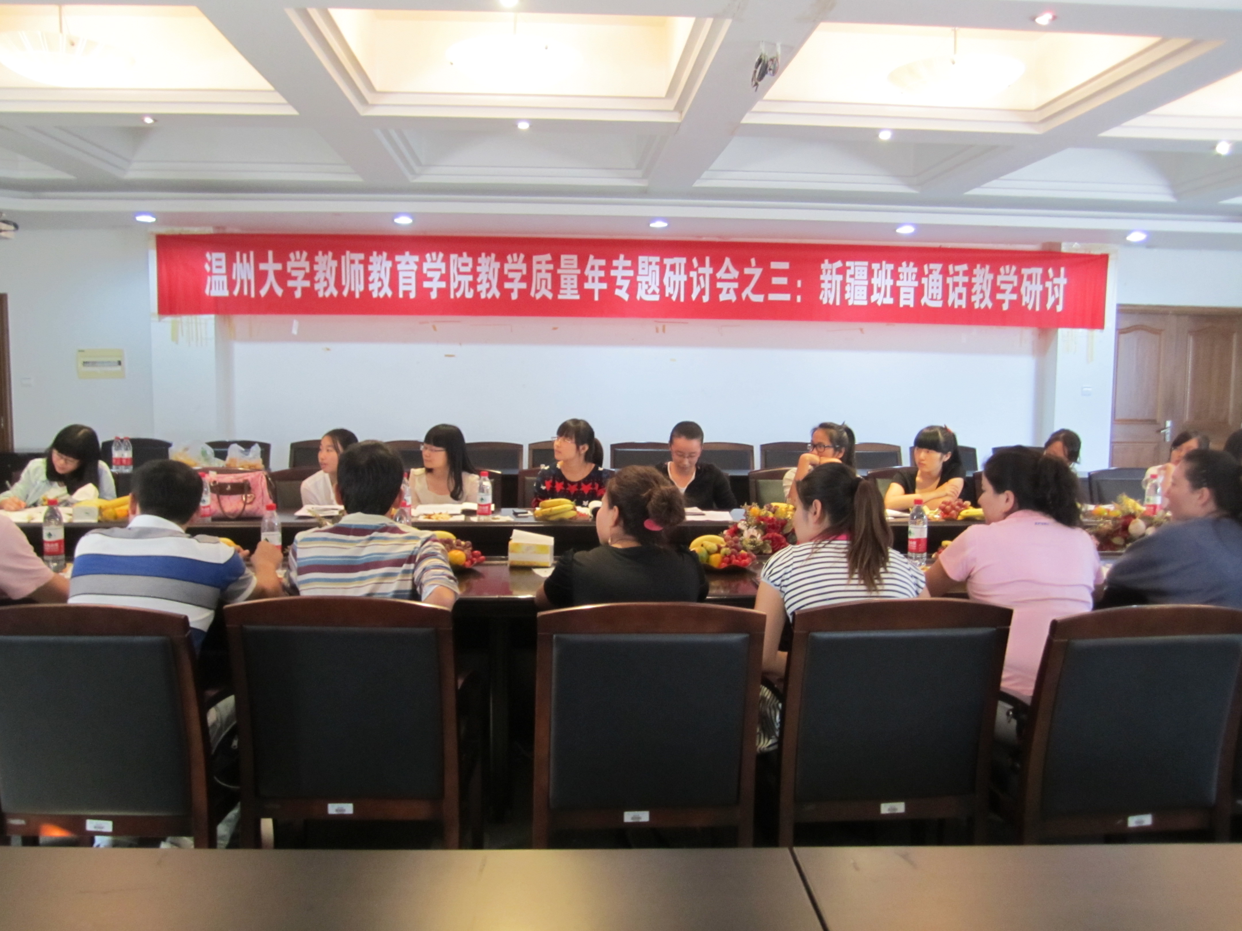 历经两个小时的新疆班普通话教学研讨会在新疆同学的感谢声中落下了帷幕,形成统一意见,双管齐下,强化说话训练,每班每周2个晚自修时间分4小组进行教学方法多样化的、趣味灵活的辅导、教学内容的选材以幼教内容为主,开展小组间、班级间说话比赛,并制定辅导计划。通过此次研讨会,具体有效地制定了为提高新疆班同学的普通话水平的相关举措,为他们今后的学习提供了一定的帮助。