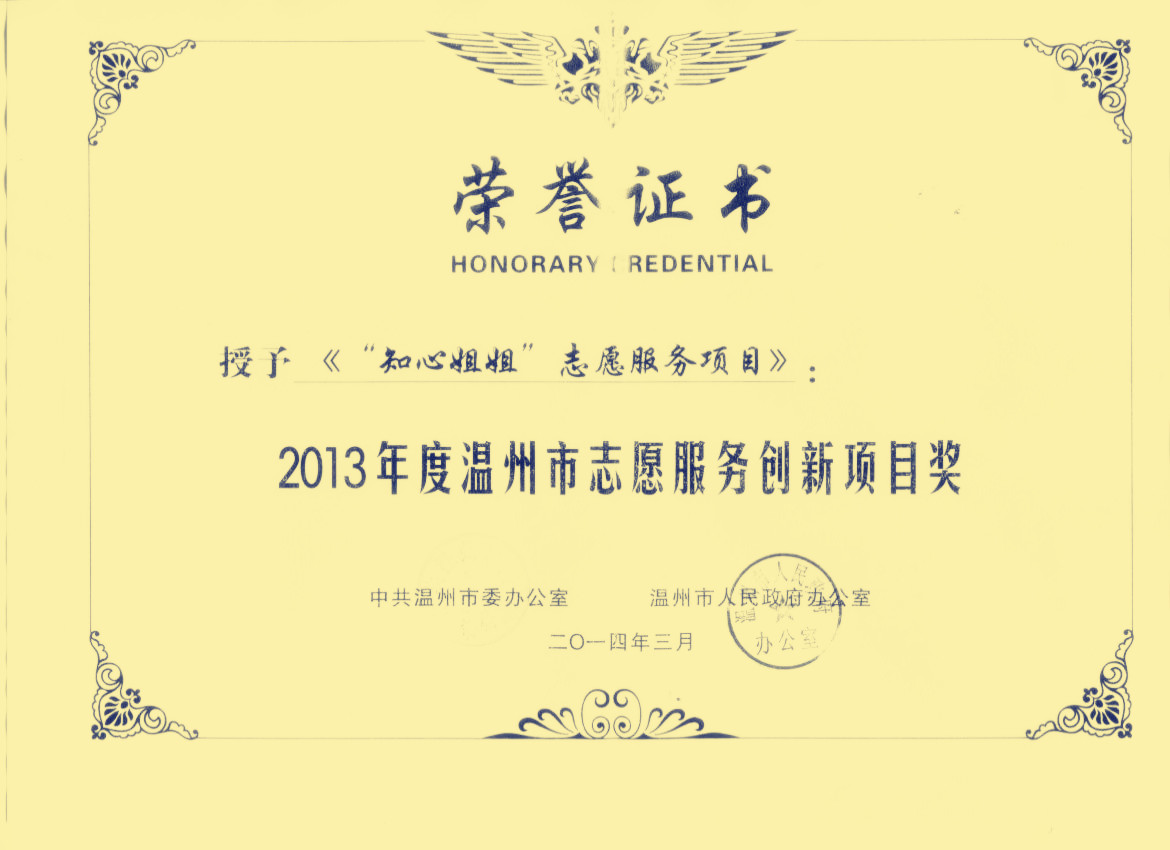 3月5日下午,温州市志愿服务工作委员会在市人民大会堂四楼新闻厅隆重举行2014年“温州市学雷锋志愿服务工作会议暨温州市志愿者协会四届二次会议”。我院“知心姐姐”荣获2013年团市委春芽计划3A 级项目及2013年温州市志愿服务创新项目奖荣誉两项殊荣。
