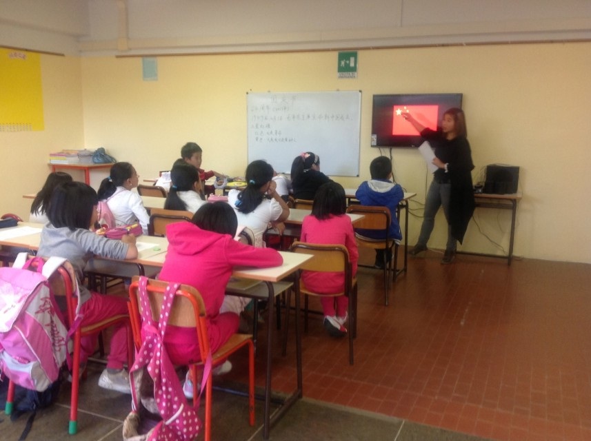 当地时间下午3点钟,该校开始了国庆周的第一堂课。帅迎老师首先给学生们讲解国庆节的由来、国庆节的时间、国旗以及其所代表的的含义。在讲解过程中,帅迎老师还给学生们耐心解释了毛泽东、毛主席、中国共产党、革命等“稀奇古怪”的词汇。由于学生们从小生活在意大利,故对以上词汇根本不理解,加之意大利语中也没有相对应的解释,因此,帅迎老师只能用意大利语、中文双语进行解释。给我留下深刻印象的是:帅迎老师(湖南人)操着浓厚的湖南口音,模仿毛主席1949年在天安门城楼上宣布“中华人民共和国成立了”的景象。学生们虽然对“口音”这一词并不理解,但还是笑成一片。想必,“中华人民共和国”一词肯定是深深的刻在了他们的脑海里。