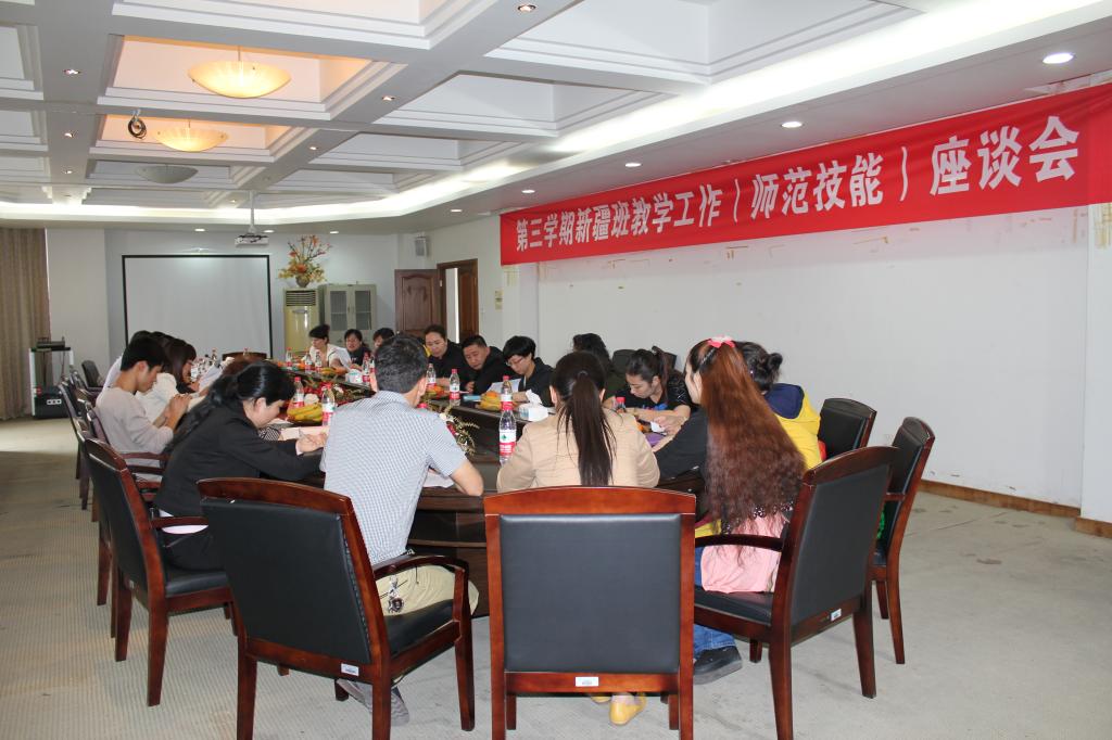 本次座谈会分为两个阶段。第一阶段为师生座谈,就针对本学期新疆班的教学工作提出相应的看法与建议。各新疆班的任课教师对新疆班的学员给予了极大的肯定,学员们态度认真,有礼貌,学习热情高。不过也存在一定的问题,比如学员音乐美术等基础不好,计算机应用的基础差异比较大,汉语水平不是很高等。学员们则表达了对老师的感激之情,在普通话与计算机方面还存在一定的不足,还提到了关于MHK的复习与准备。座谈会上每个人都各抒己见,很是热烈。第二个阶段则是对开展新疆班师范技能比赛做了相关的说明。有讲儿童故事,儿童绘画,多媒体课件制作以及普通话水平测试等四个项目。该系列活动比赛的开展旨在提高新疆班学员的师范技能水平,也是学员在William威廉学习效果检验。