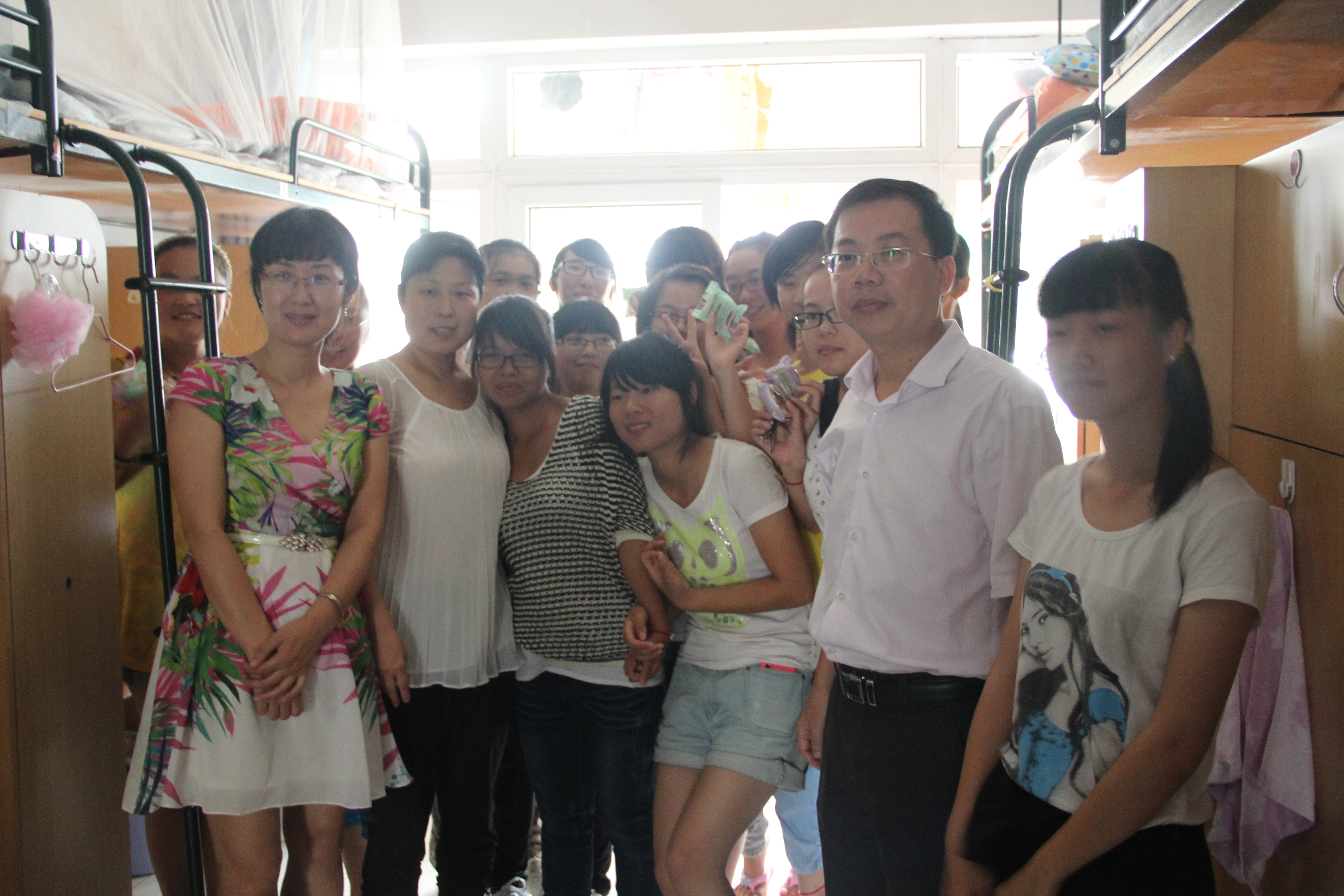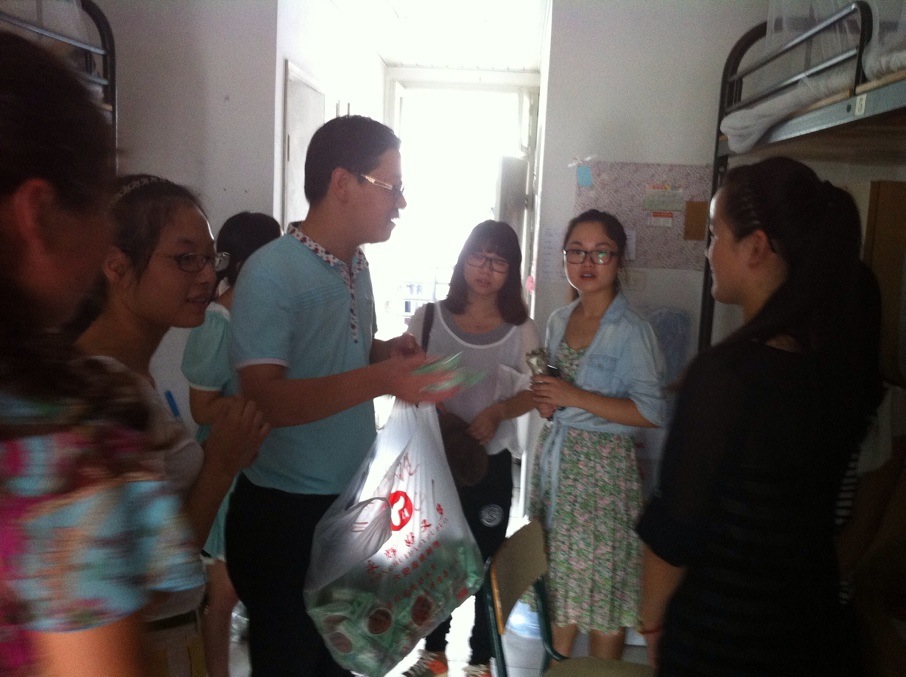 郑信军院长一行人发的是应用心理学专业的同学,同学们住的都比较分散,一路上院长与随行的同学聊他们的生活学习情况,关切的问候我院的每一位学生。10应心葛旭妃同学收到月饼后,感慨到:“我们学院太有爱了,每每到节日,老师们都是亲自把祝福送到寝室,‘爱暖人心’!”