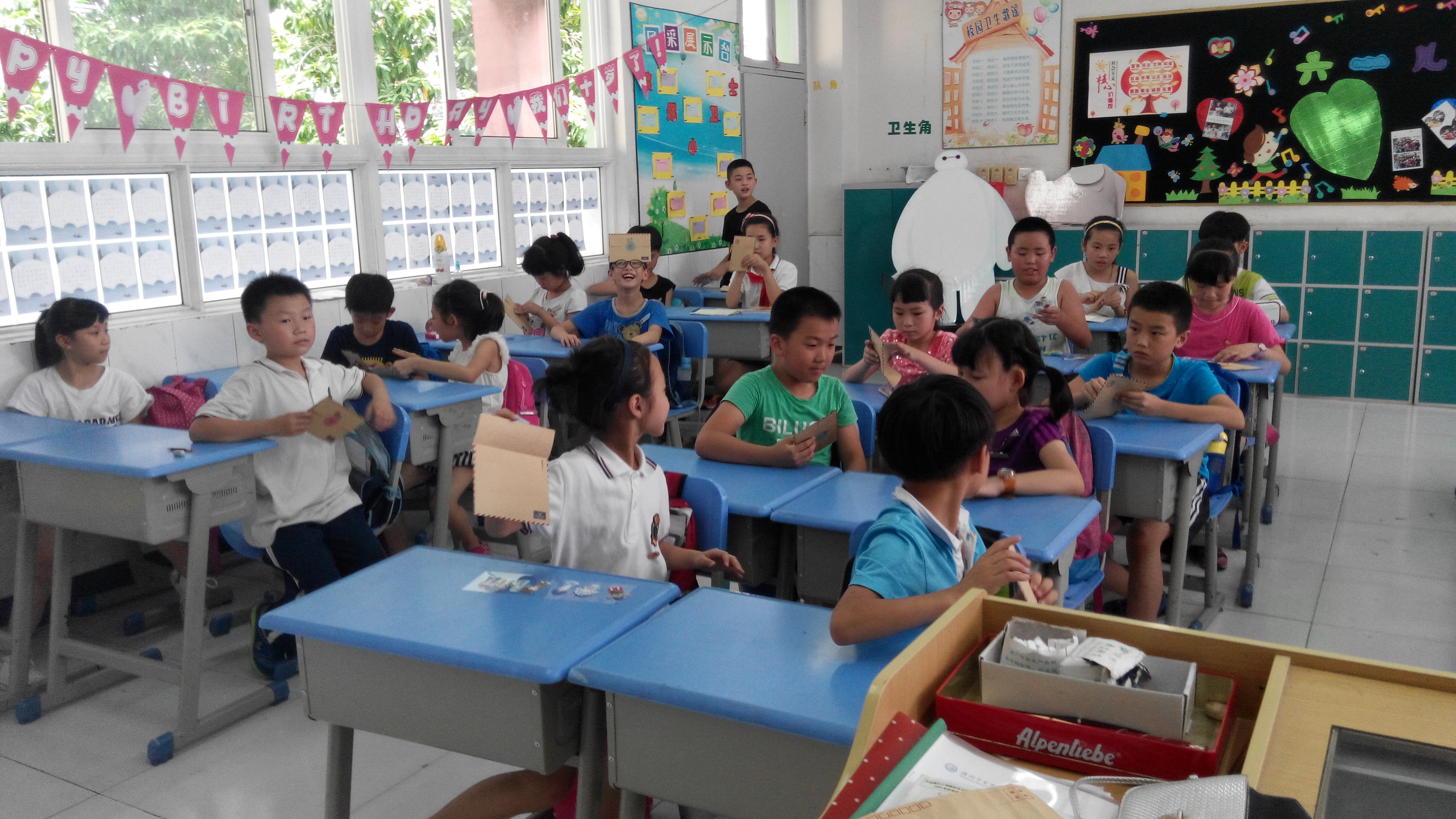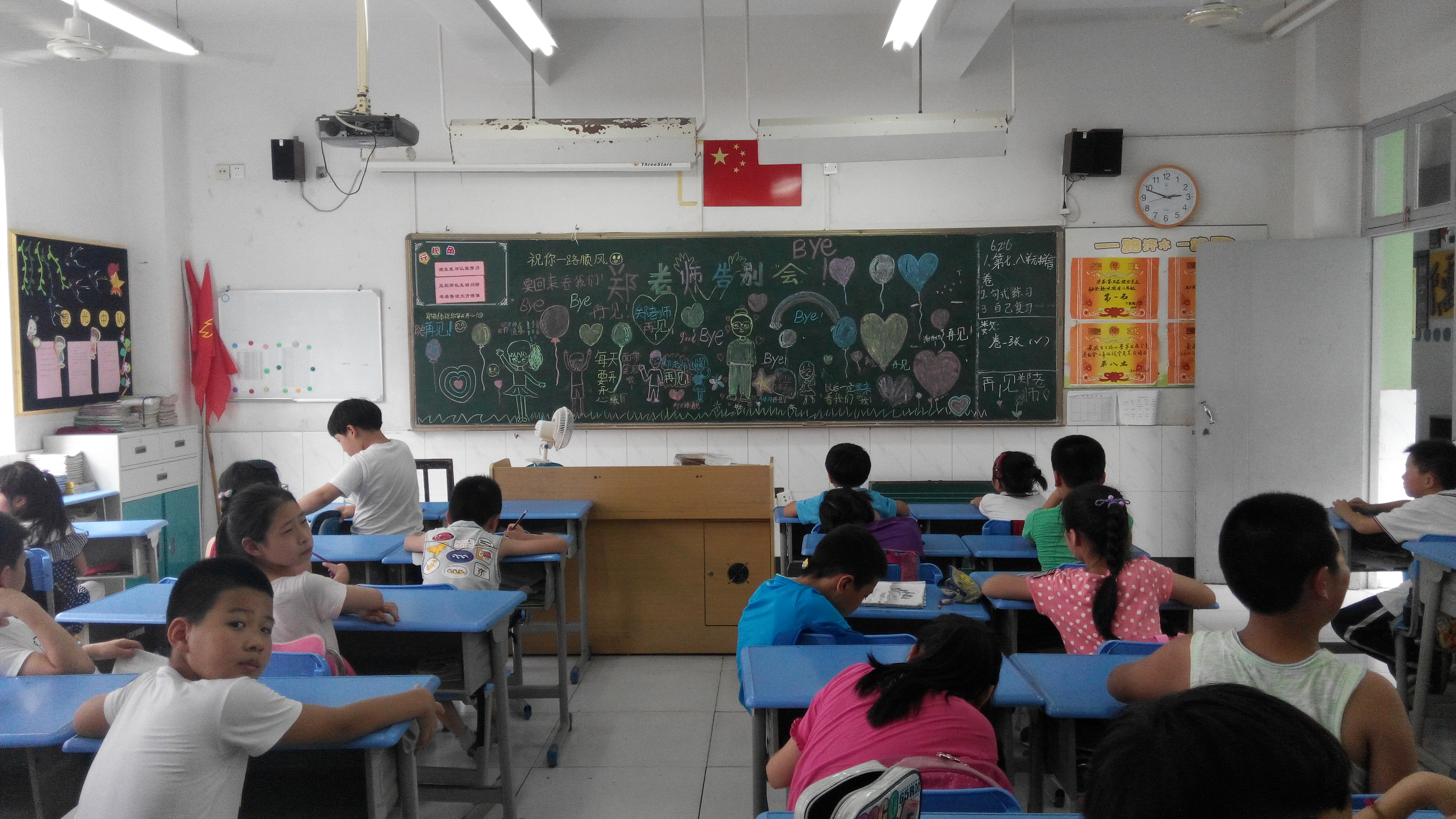 本周五,学生为我们准备了欢送会。他们用一双双稚嫩的手在黑板上画出了对我们的喜爱,写出了对我们即将离开的不舍;他们睁着一双双纯真的眼睛,表达了对我们的留恋;他们张着一张张小嘴,诉说着对我们的期盼。当不停地有学生问我,老师你能不能不走,我不知道该怎么回答,只能留下送给他们的礼物作为念想。