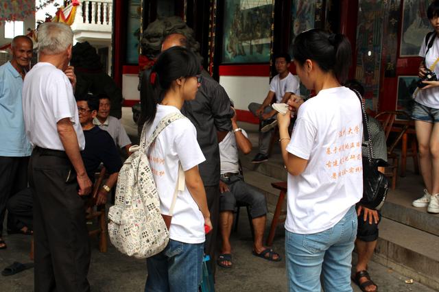 九点左右,经过一路的奔波,实践队的全体成员到达三垟湿地——实践队的第三站。在路口旁的小亭子稍作休息时,队员们与亭中的一位老人进行着简单的交流。告别了老人,队员们真正开始了三垟之行。那是一片世外桃源,没有钢筋水泥,没有废烟尾气,有的是清水嫩树以及在河边垂钓的闲适百姓。进入湿地深处,湿地里那星罗密布的老桥述说着几百年来的历史。木桥,石桥遥遥相望,更有诗人题诗其上,那是江南水乡独有的魅力。伴随着咯吱咯吱的响声走上廊桥,梁顶的词画以及古廊桥构造独特吸引着人们的注意。建筑坡度特有讲究,为河两岸的人家沟通往来的重要渠道。队员们在惊叹之余也是不是的用笔记录下实地考察得到的数据。