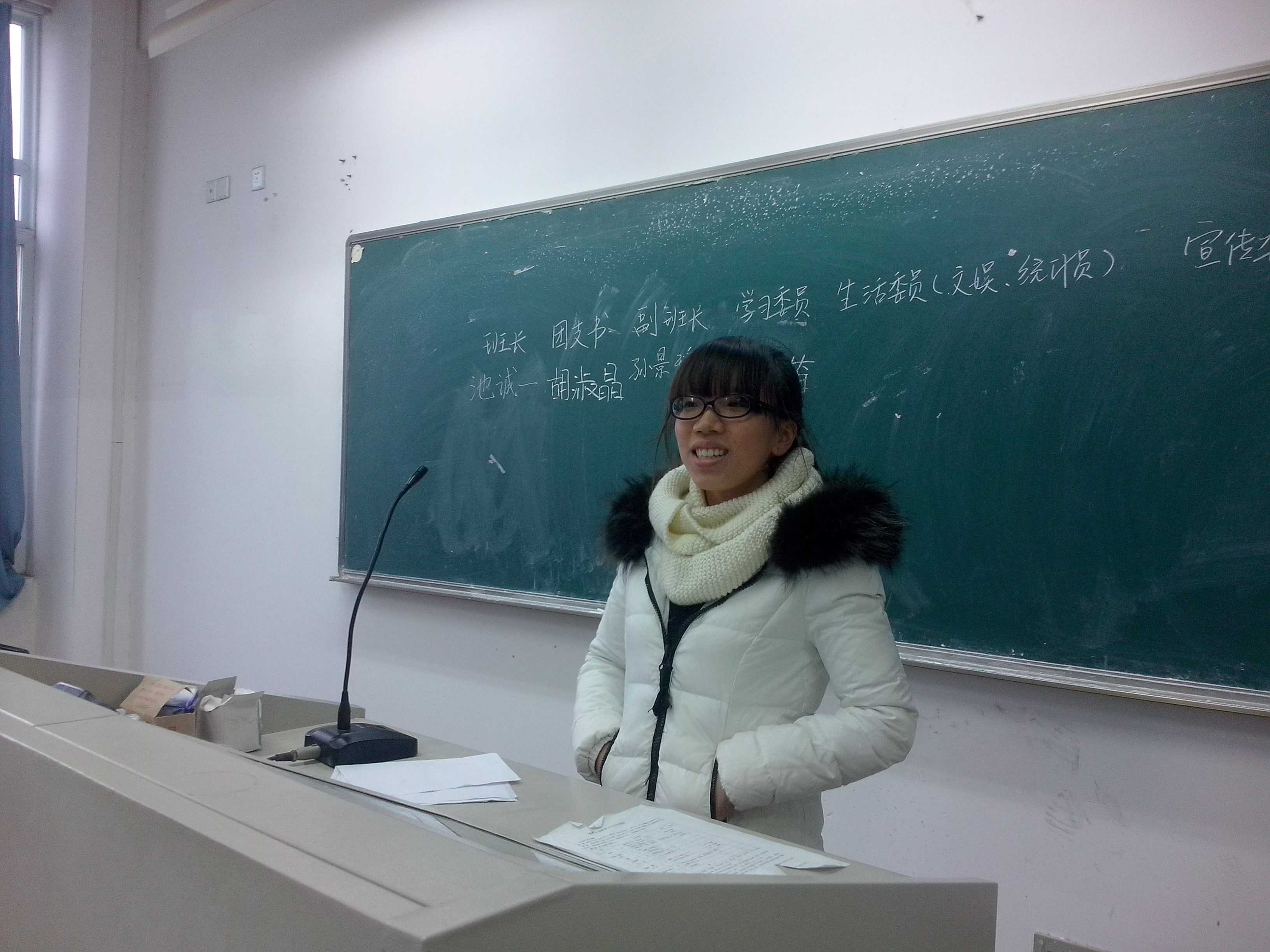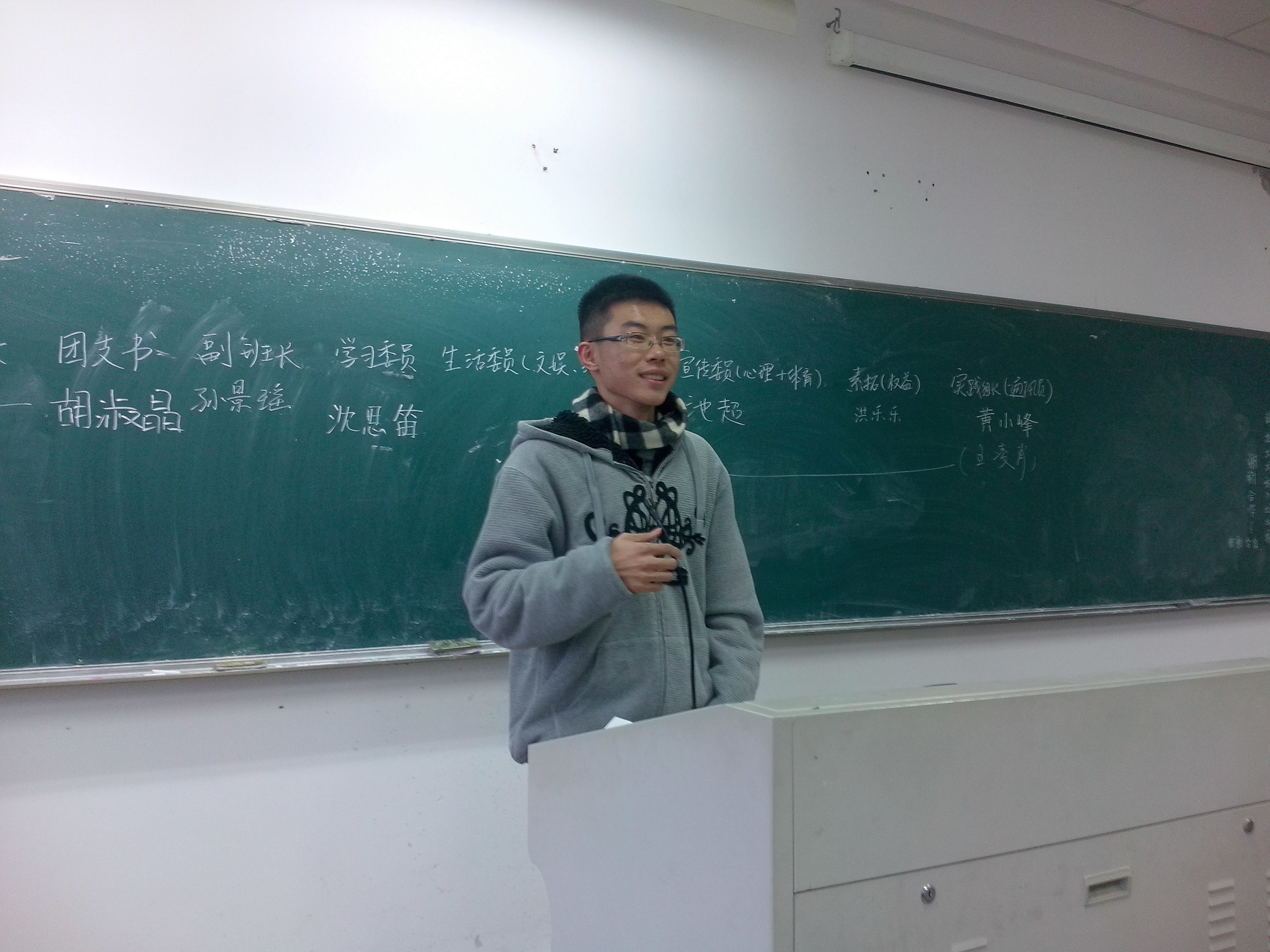 2013年12月17日下午,11小教中文班在北校3幢402教室举行了班委换届选举。此次活动由11小教中文原班长蔡琛同学担任主持,班级全体同学参与其中。活动共由三部分构成,分别是“第二届班委做工作总结汇报”、“新班委竞选”以及“新班委发表入职宣言”。