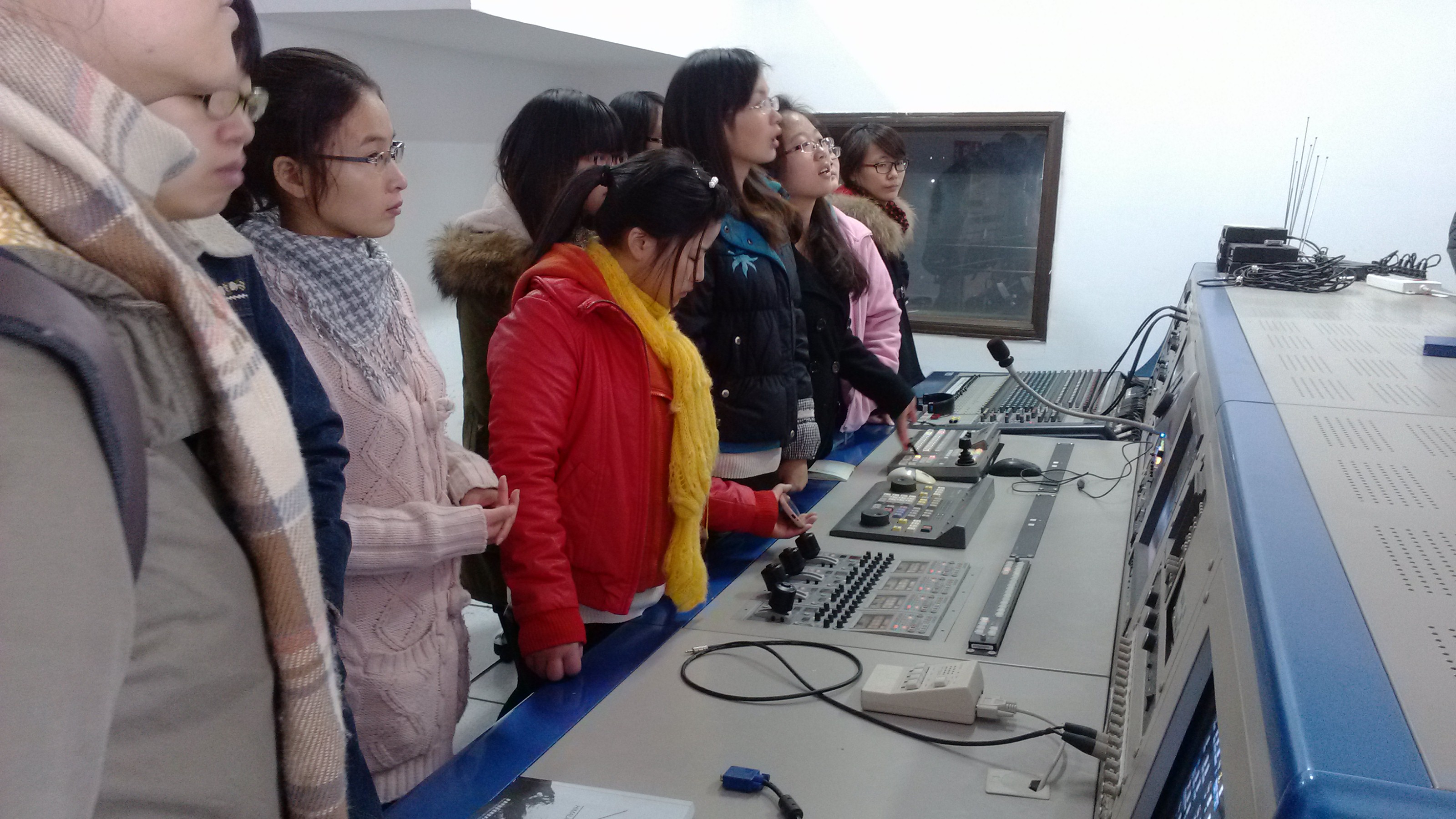 赵颖老师分两批带领同学们去熟悉认识演播室的器材,之后便让大家亲身体验。在接下去的活动中,大家积极参与,实践自己所设想好的岗位,分别实践调音师,灯光师,导播,摄像等工作,大家忙得不亦乐乎。在实践过程中,各种各样的问题随之产生,譬如一个灯光师如何更好更快的调节导播所要求的电脑灯、轮廓灯。所有的问题在老师的指导及大家的探索下都一一解决了。全班同学都热情高涨,上台演示,操作互动。偶尔几句小幽默的话语逗得老师和同学们都哈哈大笑,使得原本枯燥的学习也变得愉快了很多。