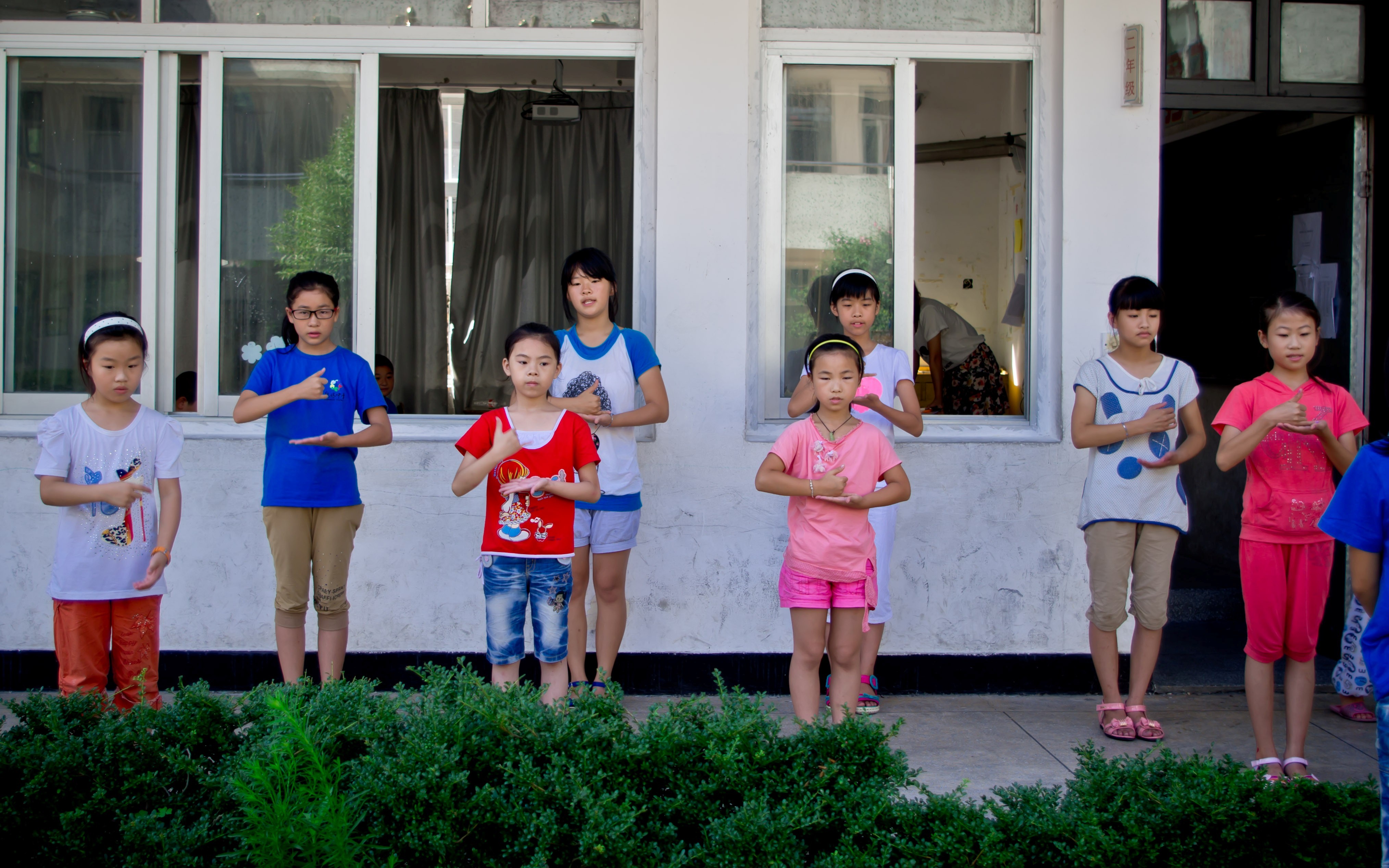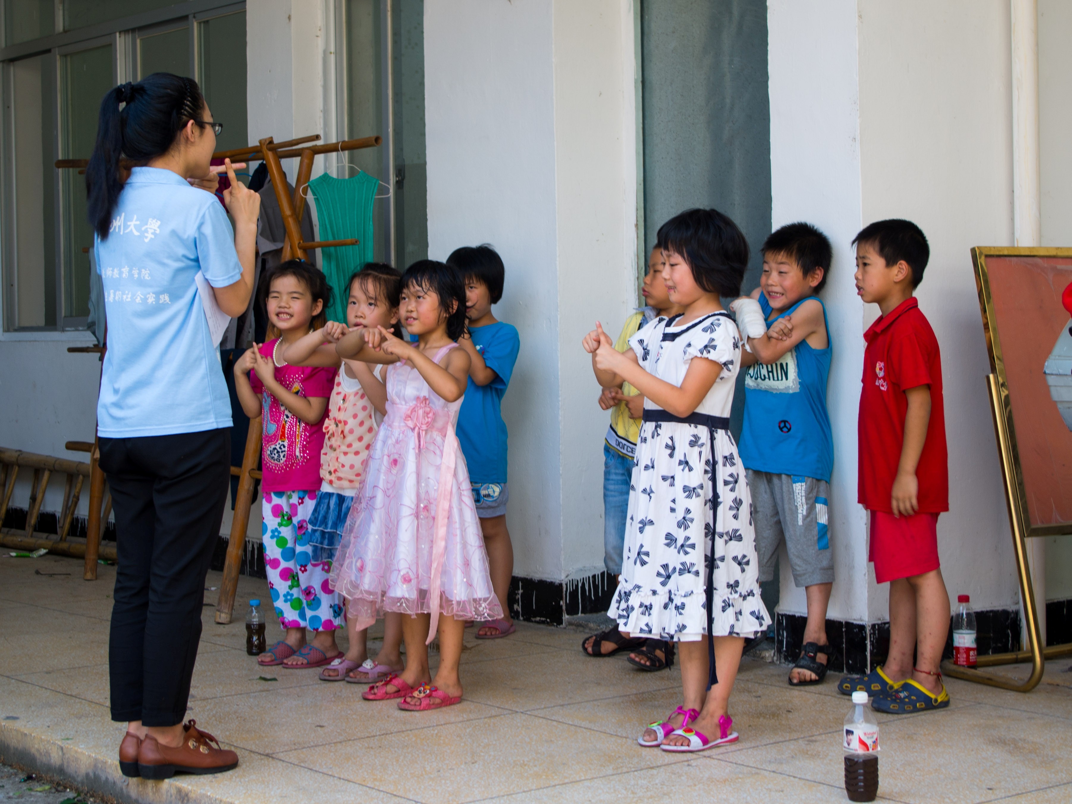 下午3点30分,尽管天气闷热、空气炙人,童谣节目组仍在进行紧张的排练。老师先是将8个孩子两两搭档,分成四组,排成最终的舞台队形。接着,欢快活泼的童谣伴奏如同一条奔流的小溪,汩汩地流向孩子们。第一首童谣是《吃馄饨》,“娒娒你显能,阿妈教你吃馄饨;馄饨汤,喝眼光;馄饨肉,配白粥;馄饨皮,配番薯;馄饨碗,吃爻倒端转……”这俏皮的温州方言活泼生动、寓教于乐,加上孩子们的演绎,令人耳目一新,眼前一亮。第二首童谣是《十二月令》,“正月灯,二月鹞,三月麦秆作吹箫;四月四,做做戏,五月五,过重午……”短短的歌谣,包罗了古老的温州年复一年的春生夏长、秋收冬藏。平时说惯了普通话的孩子们对这诙谐的温州方言感到分外亲切,一边练一边笑,排练的现场在紧张之余,洋溢着轻松、愉悦的气氛。虽说这温州童谣只是我营汇报演出的一部分,但是在排练结束之后,孩子们的嘴里仍时不时地吟出几句童谣,仿佛余音绕梁,意犹未尽。