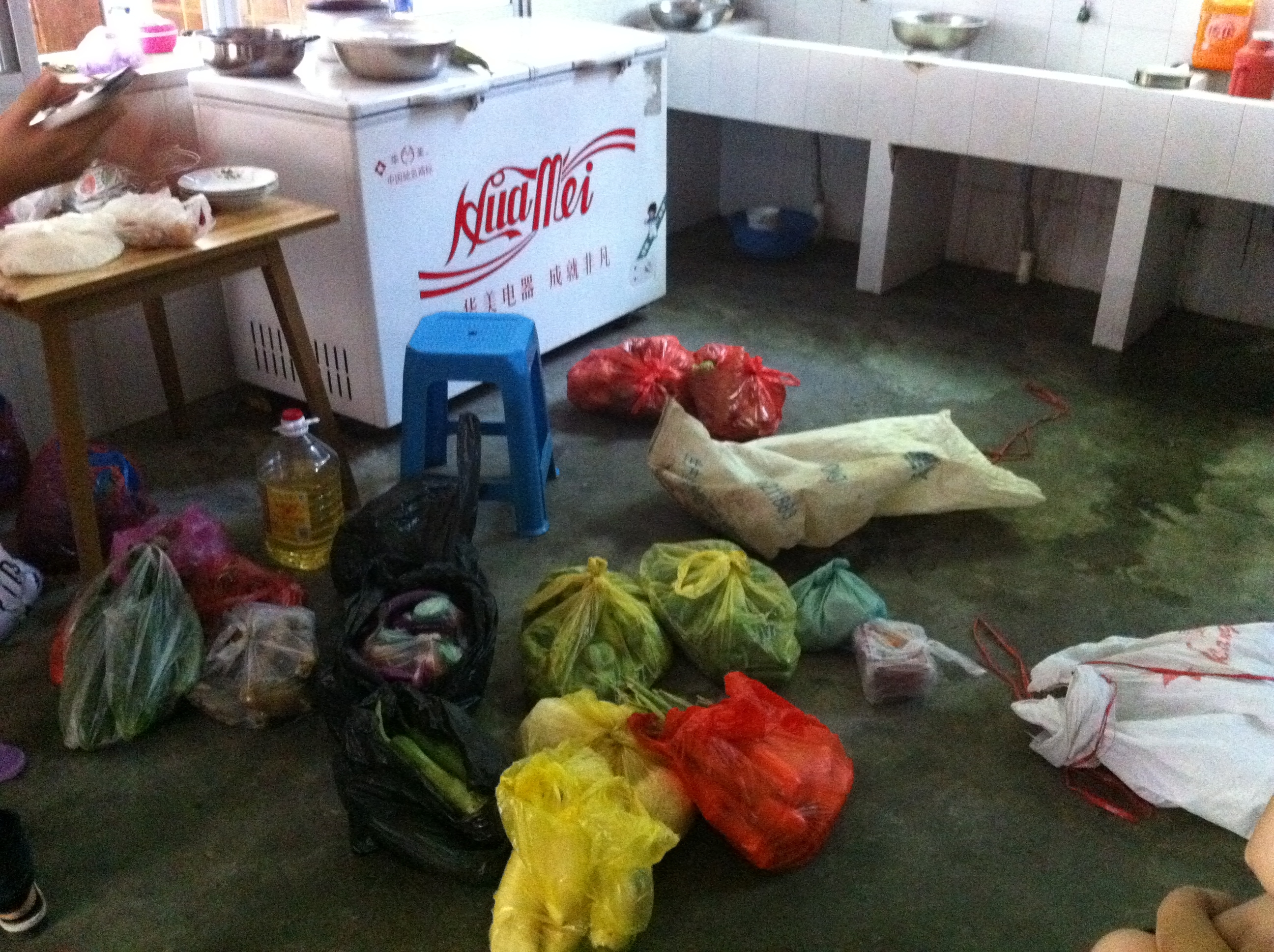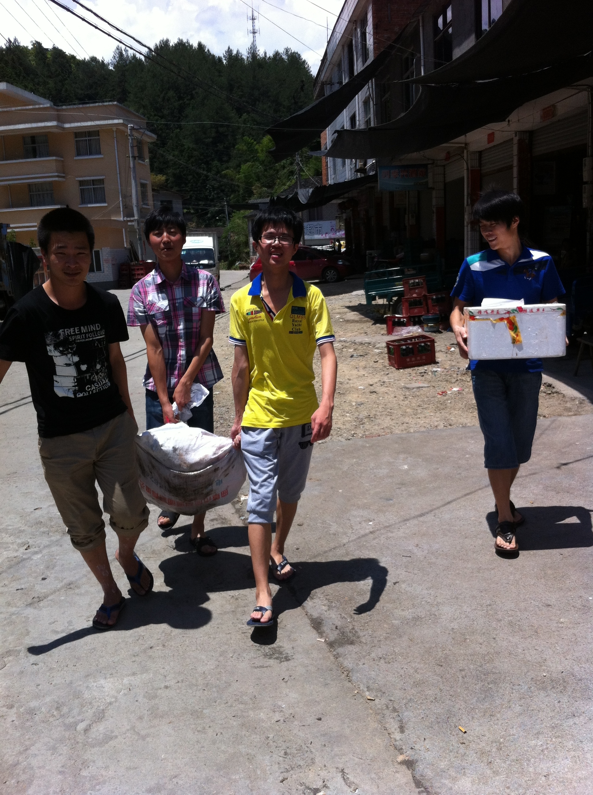 安民中心小学地处偏远山区,到处是山,村落与村落间的间隔相差十万八千里,交通十分不便。而且在这里村民们几乎是过着原始的自给自足的生活,甚少有多余的蔬菜、肉等粮食必需品,这对于来这里的短期山外人员譬如实践队极其不便。队员们每天只能吃些蔬菜,很少有机会吃到肉,就算有也只有当学校旁边的肉铺开张了,大家才能尝尝鲜。但令人感激的是远在千里之外的校长在了解我们的情况后,特地掏钱亲自采购了很多食品,然后托人给我们送了进来。中午才刚吃完饭,就看见保安叔叔急步向我们走来,原来是送东西的货车来了。队员们几乎是同时飞奔向外,此时外面的骄阳再热情,也比不上我们脸上灿烂夺人的光芒。其中最激动的当属我们的大厨郑贤文了,之前一直苦于“巧妇难为无米之炊”,现在终于可以大展身手。看着队员们你提一袋,我抱一箱,一点儿也不觉得重,反而脸上溢满笑容,这时刻我们是最幸福的。