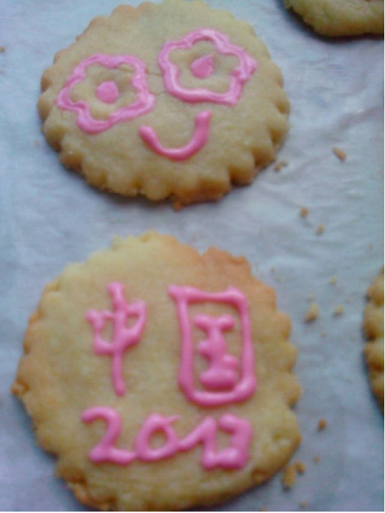最后,大家的作品都出炉了:一个心形的蛋糕,一盒形状多样的饼干,两个色泽亮丽的披萨。在等糕点冷却下来时,营员们又想出在作品上汇图案和写字留念。大家在心形蛋糕上写了“快乐”两个字,尽管这中国字弯弯扭扭,却是大家一起相处在快乐提高班最真实的感受。在饼干上,一个细心的男生写了“中国 2013”表示自己在中国这个意义非凡的快乐暑假。