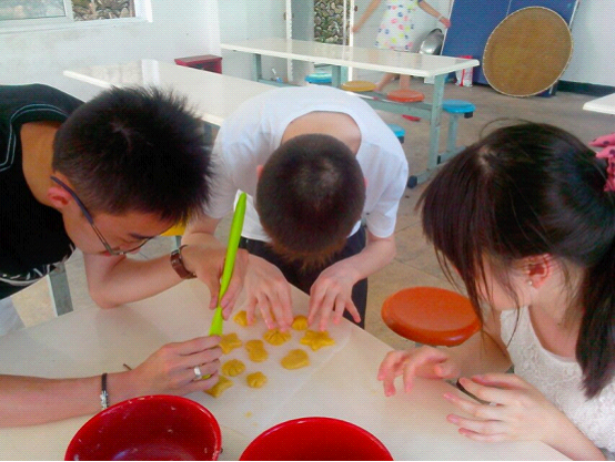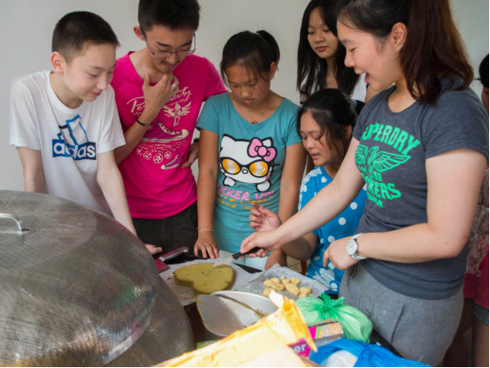 烹饪课在食堂进行。大家分工合作,有的小组做饼干,有的小组做蛋糕,有的小组做披萨。带着满满的兴趣,营员们开工啦!根据制作说明的指示,称取一定质量的面粉、黄油、发酵粉、白糖、鸡蛋等材料,按比例搅拌在一起,一步一步,营员们特别细心。大家也同时分享自己在国外学校的各种趣事和经历,烹饪课上洋溢起自由、欢快的笑声。和好粉后,饼干组的成员们开始大显手艺了。他们用筷子或徒手做出了形状各异的饼干,瞧,筷子一挤一挤就压出了朵朵花瓣的褶。还有爱心、猫、星星,看着这些形状,队员们似乎能想象到它们烘烤后的美味模样了。当然,蛋糕组和披萨组也毫不落后,大家各显身手。