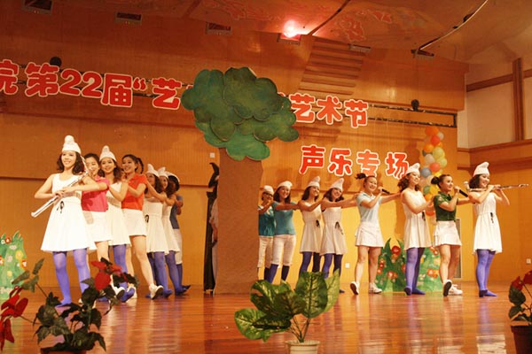 在当天晚上举行的声乐专场中,我们班钟林静同学以一首宋祖英的名曲《天蓝蓝》,获得了全场的好评。精美的服装,深情的演唱,唱出了祖国的大好河山,唱出了人民的美好生活。随后王婵同学与郑科科同学一起表演唱的一首《簸箕上的麻雀》,生动的唱出了一只只活泼可爱的小麻雀偷酒喝的情形,加上精心编排的舞蹈动作,使得这个节目更有看点。最后的儿童表演唱《蓝精灵》吸引了全场所有观众的注意力。在原基础上进行从新创作的歌词,模仿蓝精灵的衣服以及配件,还有同学们动听的歌声,无不让观众为之疯狂,重温了童年的那观看《蓝精灵》时的美好时光。