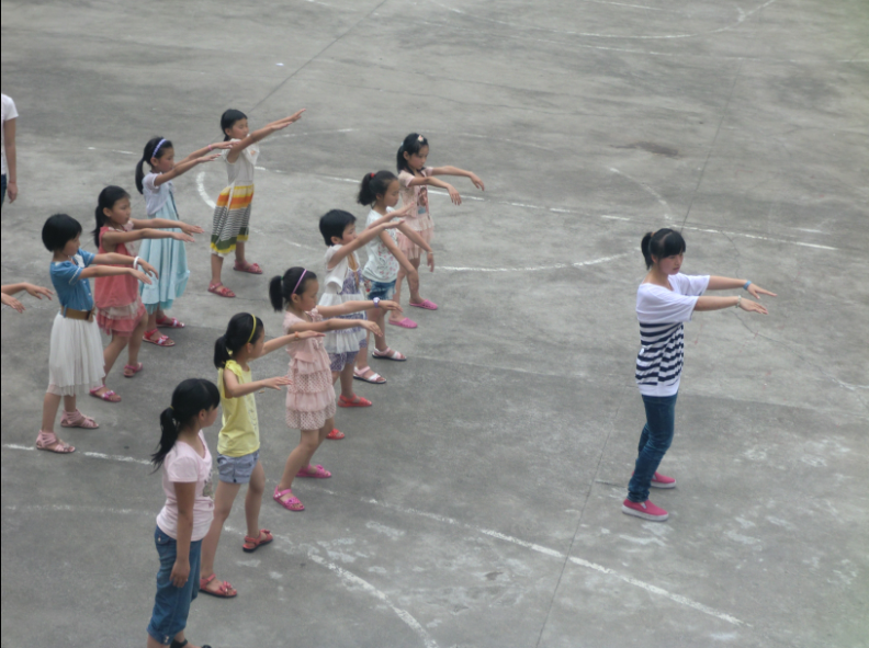 叮铃铃,叮铃铃,上课的铃声响起来了,两个美丽的小老师踏着自信的步伐走进教室,在组织学生排好队后,一前一后的领着学生走向操场。尽管我们的学校建在山脚下,又是四面环山,但是仍然抵挡不住炎炎烈日的炙烤,滚烫的地面不断地往上冒着热气。学生一共分为四列,一个老师在前面讲解演示,另外一个在下面纠正指导学生的动作,双剑合璧合作无间。今天的上课内容,主要是二十四式太极拳的前两节——起势和左右野马分鬃。可能同学们之前没有接触过太极拳,大家学的速度有点慢。对于这帮孩子来说,要打好太极拳确实有点难, 所以我们的小老师尽量把动作分解开,先教脚步动作,再配上手势,重复了一遍又一遍,直至学生学会了为止。看着有些同学由于没有掌握要领,小小的身子东倒西歪的样子,真真是可爱至极。也有一些同学很聪明,抬手,提脚,依葫芦画瓢一气呵成,尽管动作还略显稚气,但已经有那么点架势了,想必再过不久他们就会有所收获。
