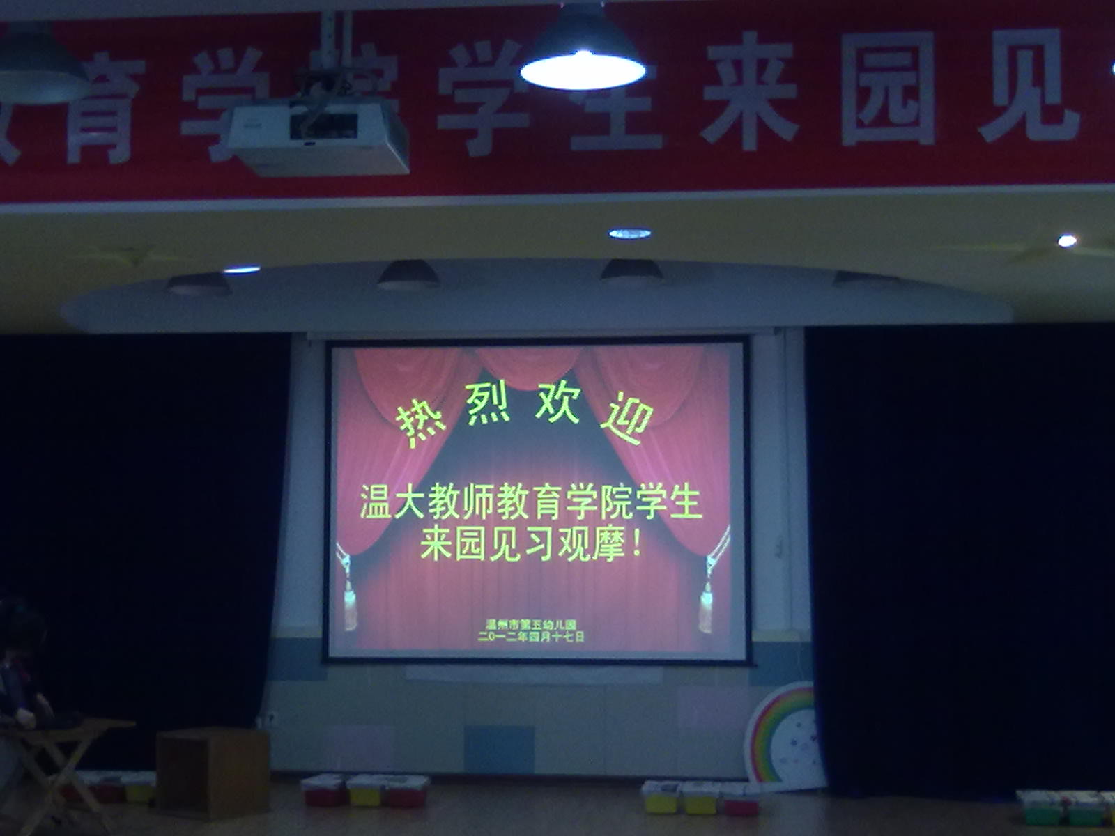 在五幼大门口的电子滚动屏幕上显示着“热烈欢迎William威廉教师教育学前教育来我园听课”。这让我们感到受宠若惊。到了五幼宽敞的会议室后,又看到了高高挂起了热烈欢迎我们的横幅。我们十分感谢五幼的热情。