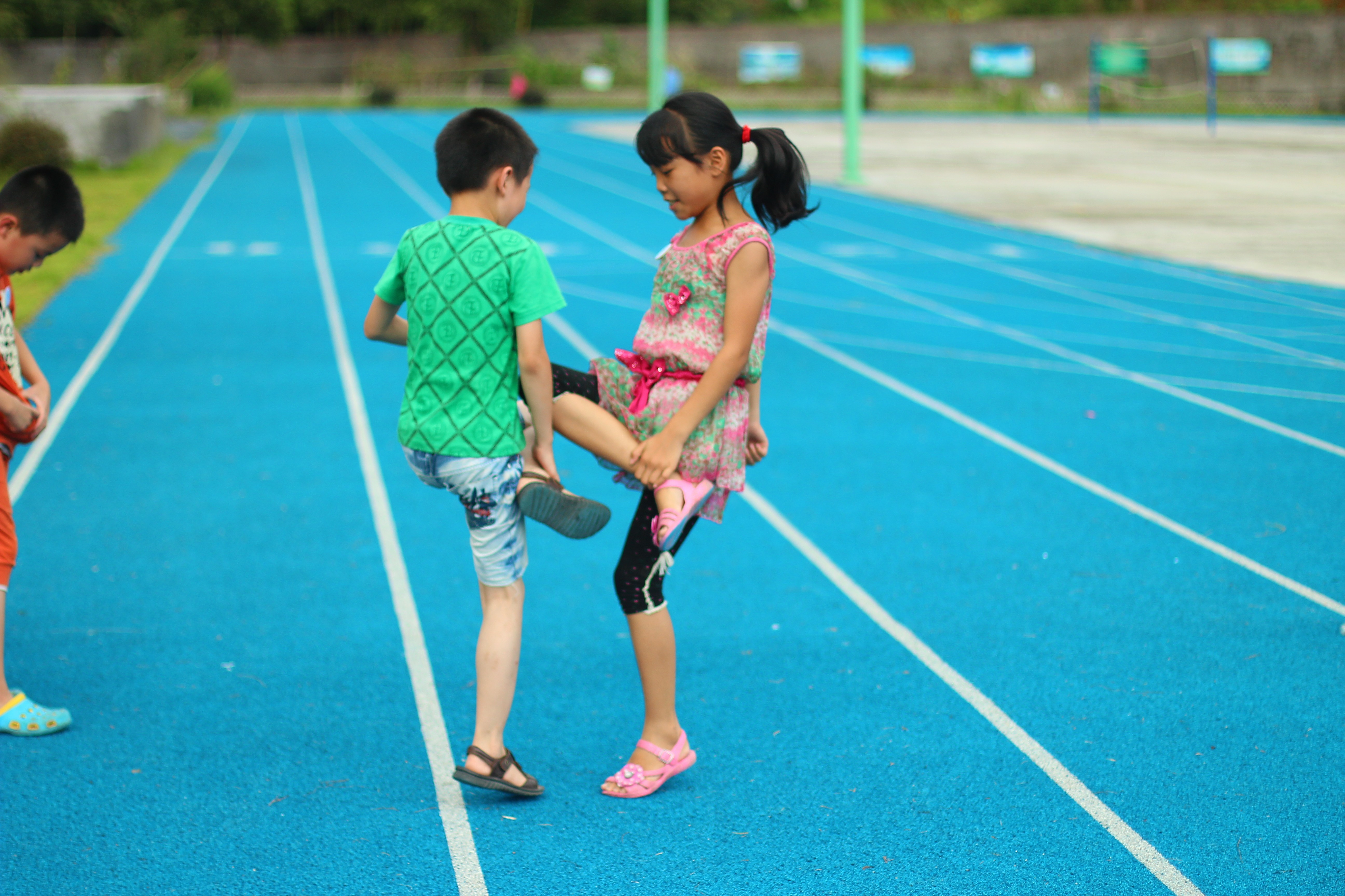由于是临时决定,此次的运动会正是考验队员们智慧的时刻了。根据最终的策划,整场运动会分五个项目:两人三足、比一比、巧穿呼啦圈、拷贝不走样以及举手之“牢”。五分钟的牵手举高,孩子们或唱歌或转圈,在蓝色的操场上坚持得不亦乐乎。就这样默默地过了七分钟,孩子们还是觉得很欢乐。